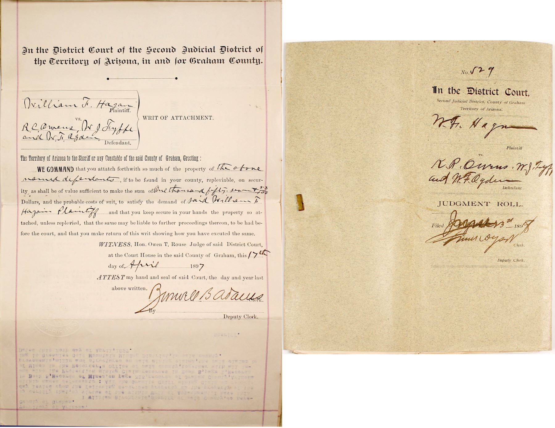 William Hagan v. KR Owens, WJ Fyffe and WF Ogden. Suit is for indebtedness of $1057.53 for unpaid wares. Filed in Arizona Territory. Arizona 1897