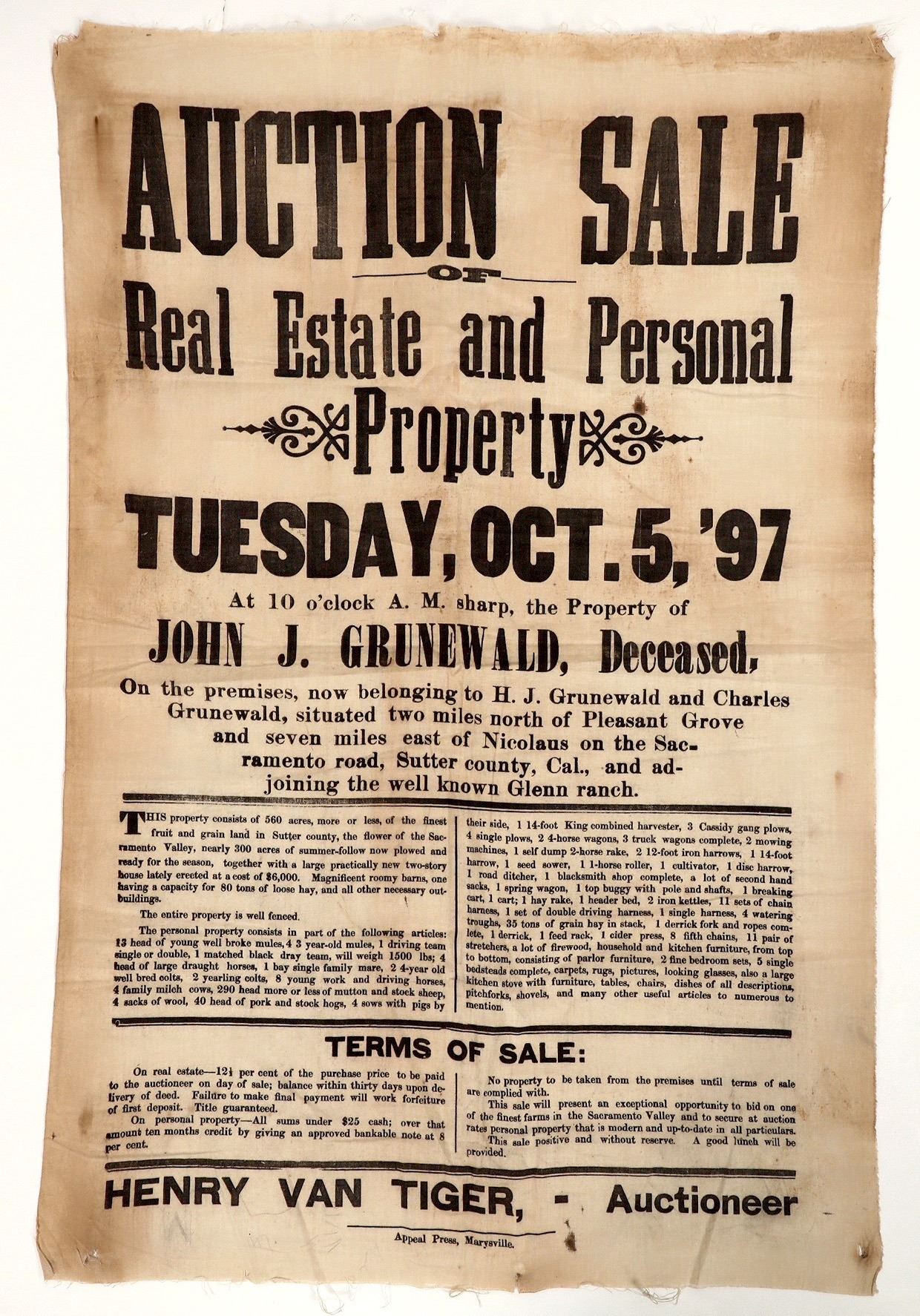 26 x 17" cloth broadside advertising the 1897 sale of the estate of John Grunewald near Pleasant Grove on the Sacramento Road, Sutter County, California. Property is 560 acres fruit and grain land, barns, and a two-story house. Also lists farm animals and equipment. Henry Van Tiger, Auctioneer. Printed on cloth by Appeal Press, Marysville. Some staining and age discoloration.