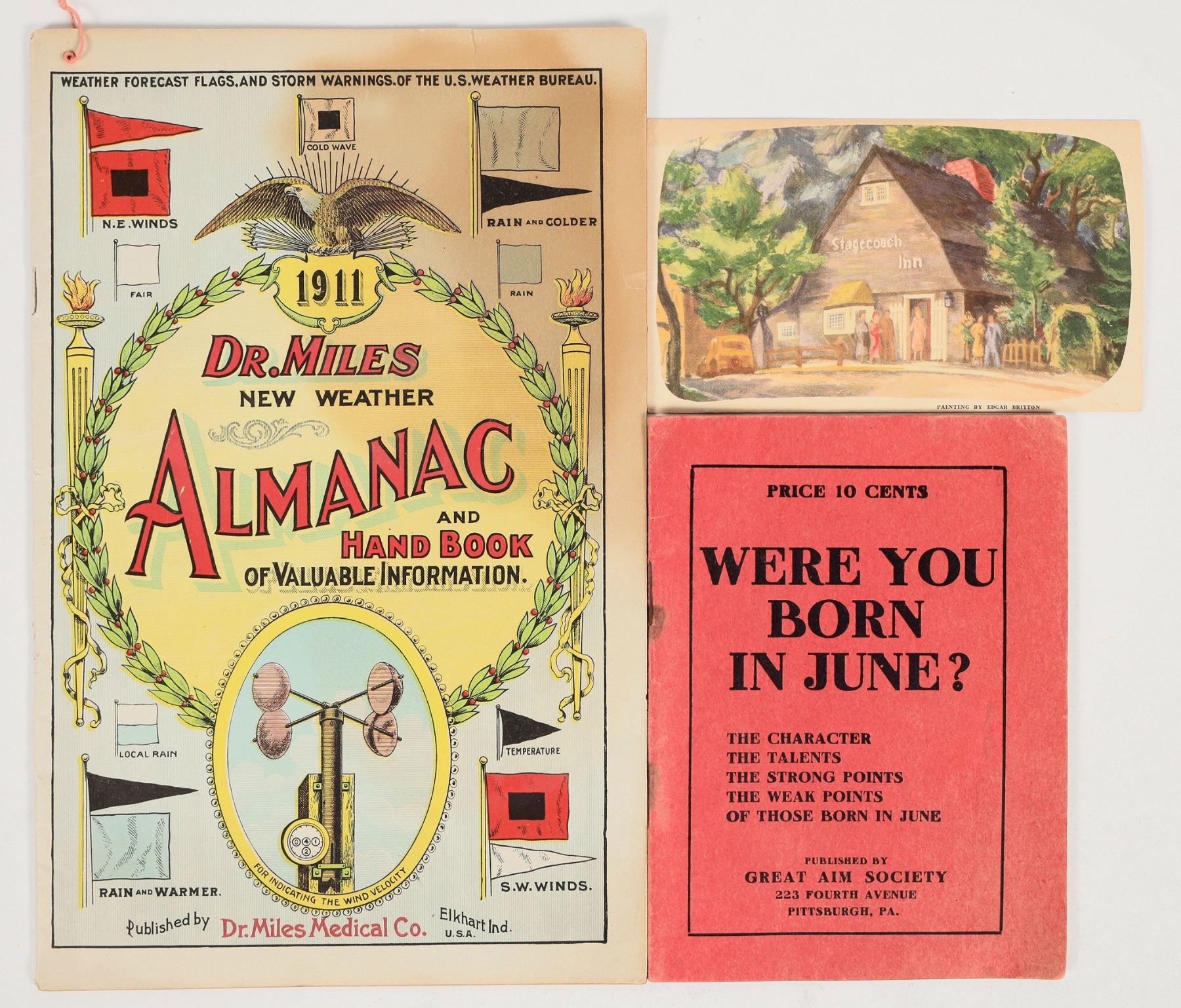 Group of 4 pieces of ephemera dating 1908-1918. Includes a recipe card from the famous Stagecoach Inn and the 1911 Dr. Miles Weather almanac as well as two rare/odd pieces: a 1909 pseudo-astrology book about people born in June and a 1918 pamphlet urging U.S. soldiers not to have sex with prostitutes.