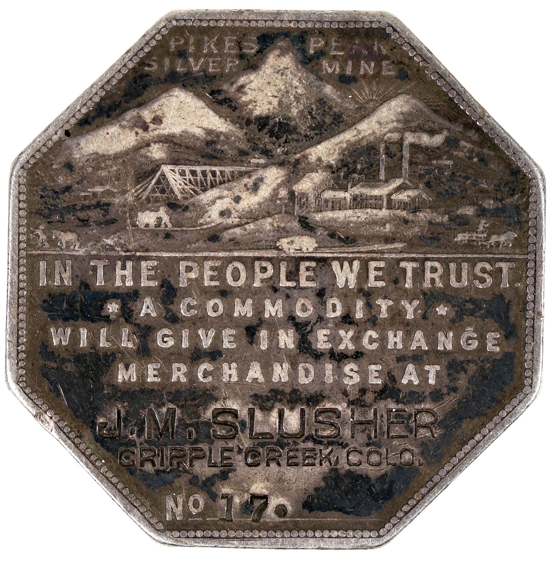 Obverse: Mining scene; Lettering: In the People We Trust. / * A Commodity * / Will Give in Exchange / Merchandise at. Below space for imprint, No. J. M. Slusher / Cripple Creek, Colo.