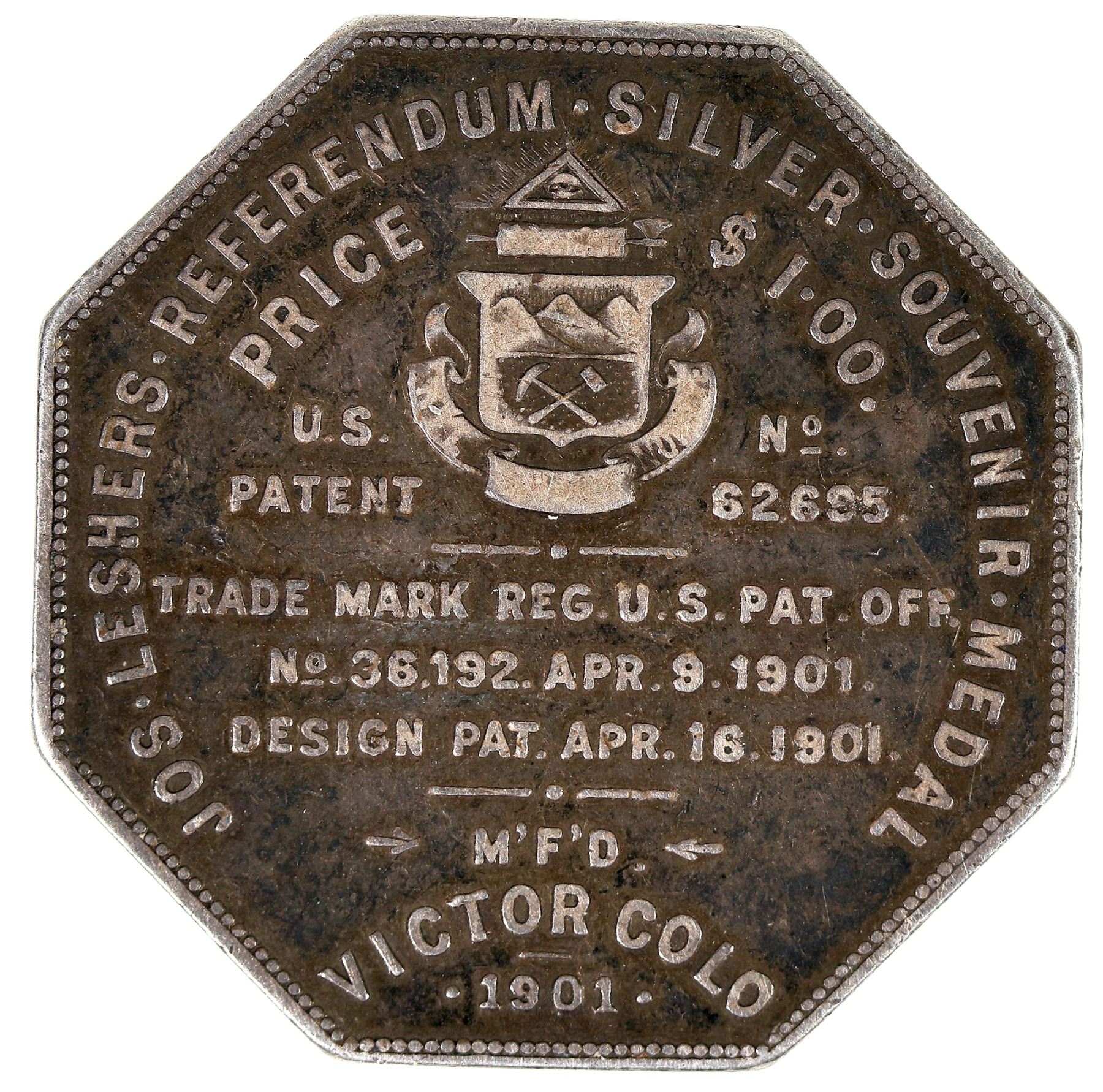 Reverse Jos. Leshers Referendum Silver Souvenir Medal; State Seal device separates Price and $1.00.; to left of device, U.S. / Patent, and to right, No. / 62,695; in six lines below, Trade Mark Reg. U.S. Pat. Off. / No. 36,192. Apr. 9, 1901. / Design Pat. Apr. 16, 1901. / M'f'd / Victor Colo / 1901