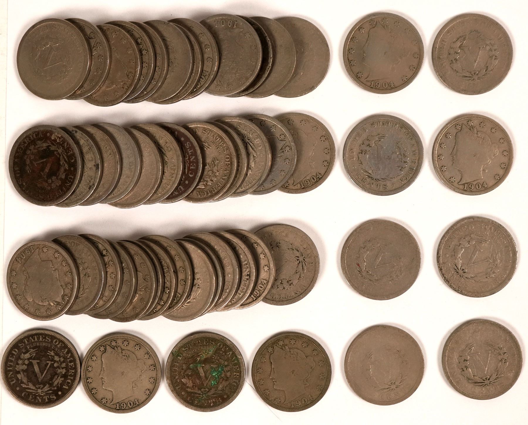 55 Liberty Head nickels minted in 1904. Graded AG-F.