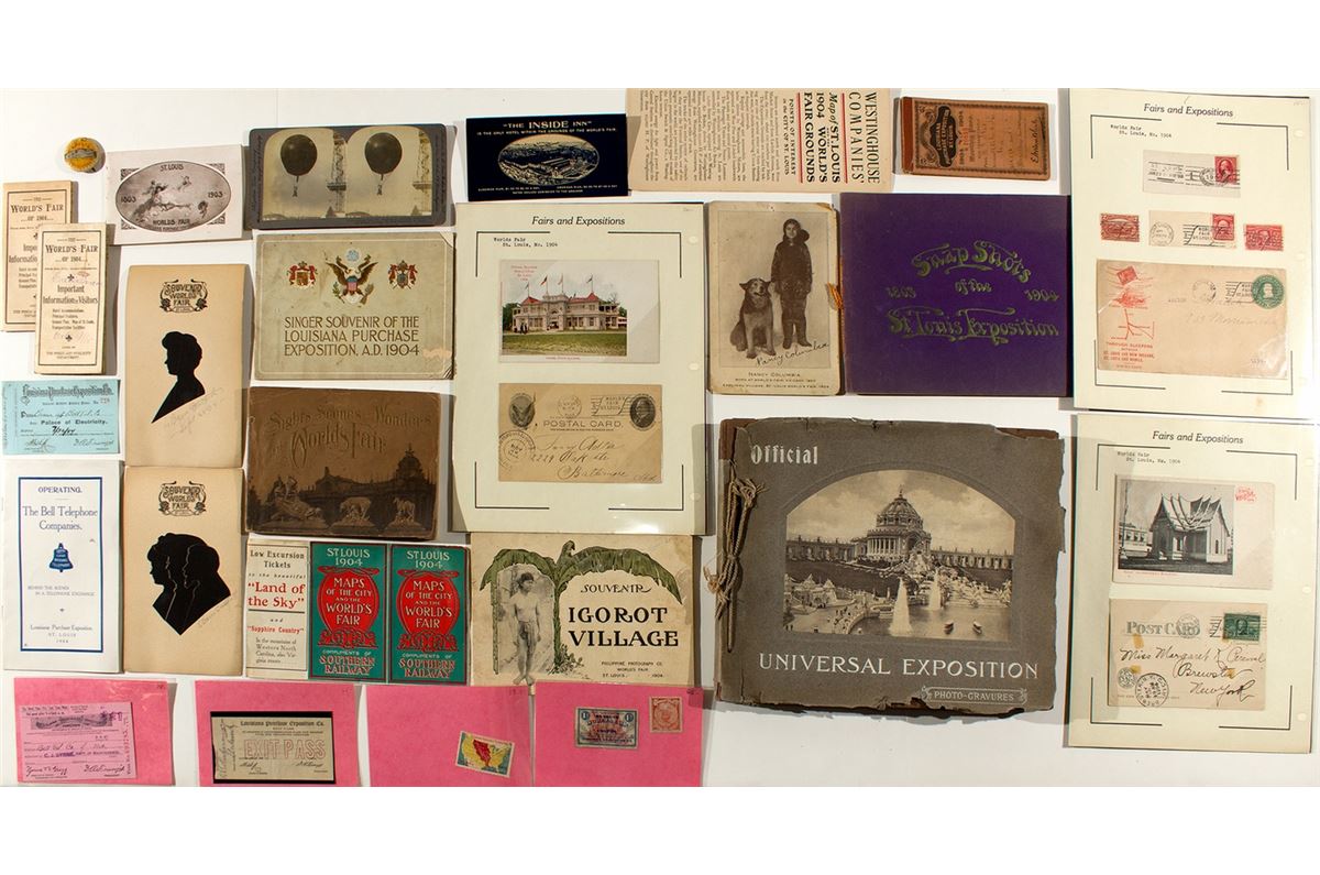 Varied group of 20+ items. Includes: Official Universal Exposition Photo-Gravures. Softcover, string bound. The Official Photographic Co. Includes 47 (6.25"x 8.25") prints mounted on brown paper. Excellent views. Besides chips to cover, book is in great condition; cabinet card of Nancy Columbia (Eskimo girl); souvenir booklet, "Igorot Village"; souvenir booklet from Singer Sewing Co.; souvenir booklet, "Sights, Scenes and Wonders at the World's Fair," Robert Reid; maps of the city and the World's Fair (9.25" x 15.5") (Southern Railway); booklet, "Snap Shots of the Saint Louis Exposition, 1904" (White City Art Co.) (photos on linen pages); small 1899 souvenir booklet of views compliments of the St. Louis Car Co. (Benesch Art Publishing Co.); Exit Pass; Keystone stereoview of balloon; one cent Coupon for Free Transportation (Standard Embossing Co.); booklet for Inside Inn (only hotel on fairgrounds); two copies of booklet from Press & Publicity Dept. with ground plan and map of St. Louis; booklet for The Bell Telephone Companies; Kansas expo. pin; pass to get into the Palace of Electricity; Workmen's Weekly Pass; monthly pass with badge photo.; various stamps and covers; and two souvenir cards with silhouette cutouts. Please inspect! (Prag Collection)