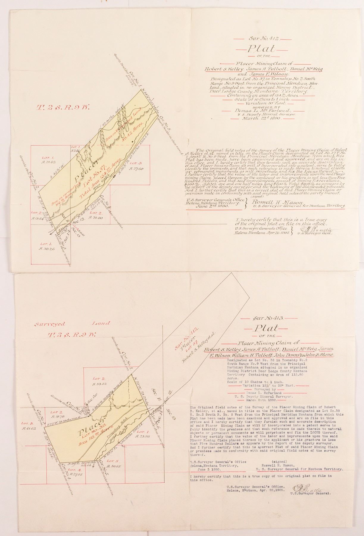 Two pages with color map of claims. 1905 certified copies of an 1880 Plat for Robert S. Kelley and company's claims in Deer Lodge County. 13" x 18". Folds with some separation.