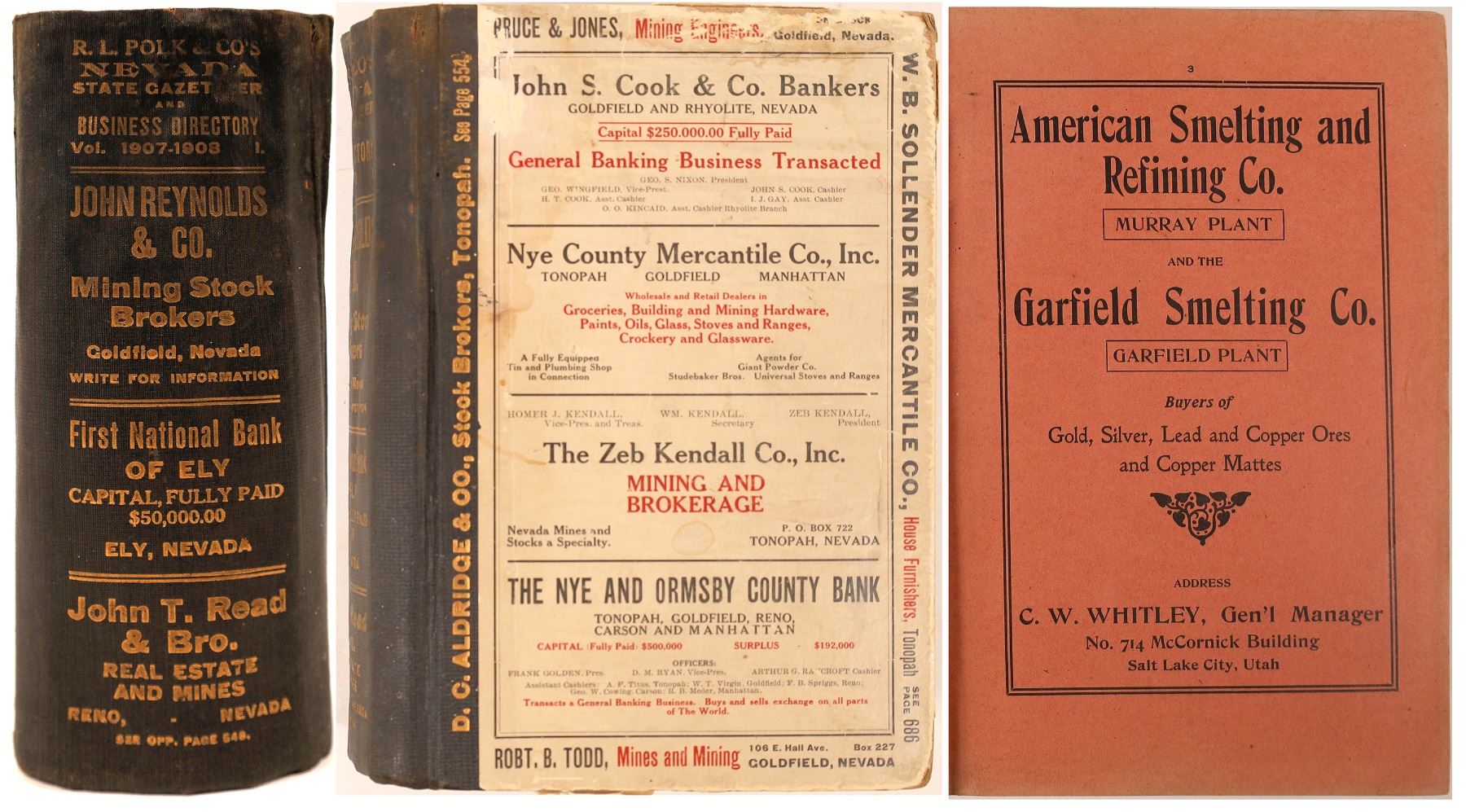 WOW! What a resource for that narrow window in Nevada history where the Goldfield and Tonopah area were the center of all activity. By the 1910 census, many businesses and people had moved on to the next great mining camp. Lists corporations in Nevada, Mining (and other) laws, post offices, railroads, etc. Small towns have listings too: find Mr. Benton of Acoma, Williams of Alpine, Colvin of Lida, Siegel of Siegel, Hardwick of Sheepshead, etc. 3 1/4" thick full of Nevada history! Definite condition issues with the cover that is being eroded. Written on inside cover is “North Western Mining Company, Nov. ’07, Reno, Nev.” The binding is loose (it is one heavy volume), but the pages are strongly attached! (W.D. Miles Collection)