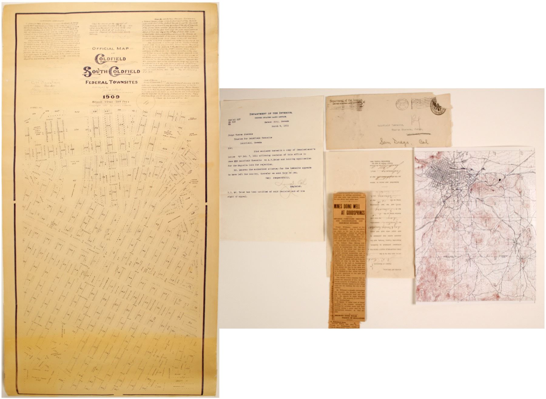 In 1909 Goldfield was in its heyday and this map shows just how big the town was. The map comes with a 1911 Department of Interior letter. Blue line print map approximately 20 x 30". Record of townsite lots in public notice published by the Daily Tribune. The letter from the DOI on a decision to reject the Magnolia load. Nice early Goldfield history. Date: 1909 City: Goldfield State: Nevada HWAC# 77448