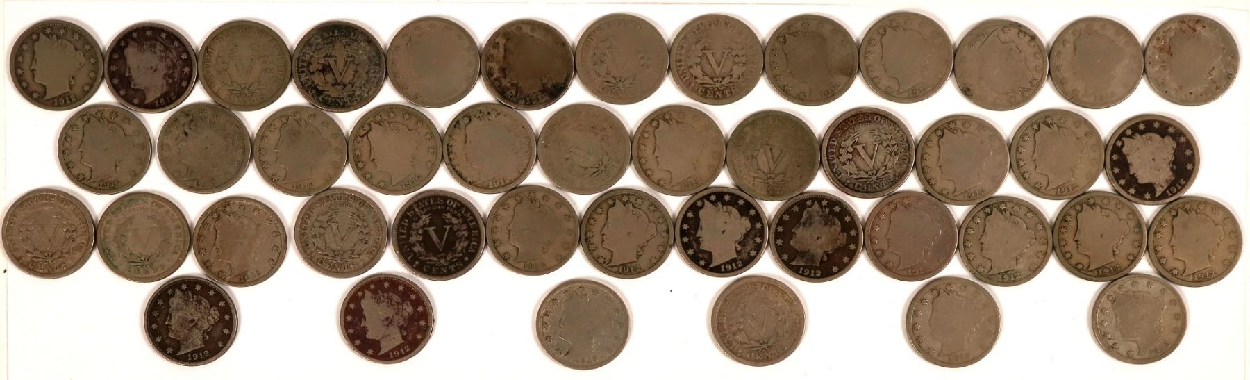 43 Liberty Head nickels minted 1912 at Denver Mint. Graded AG-VF.