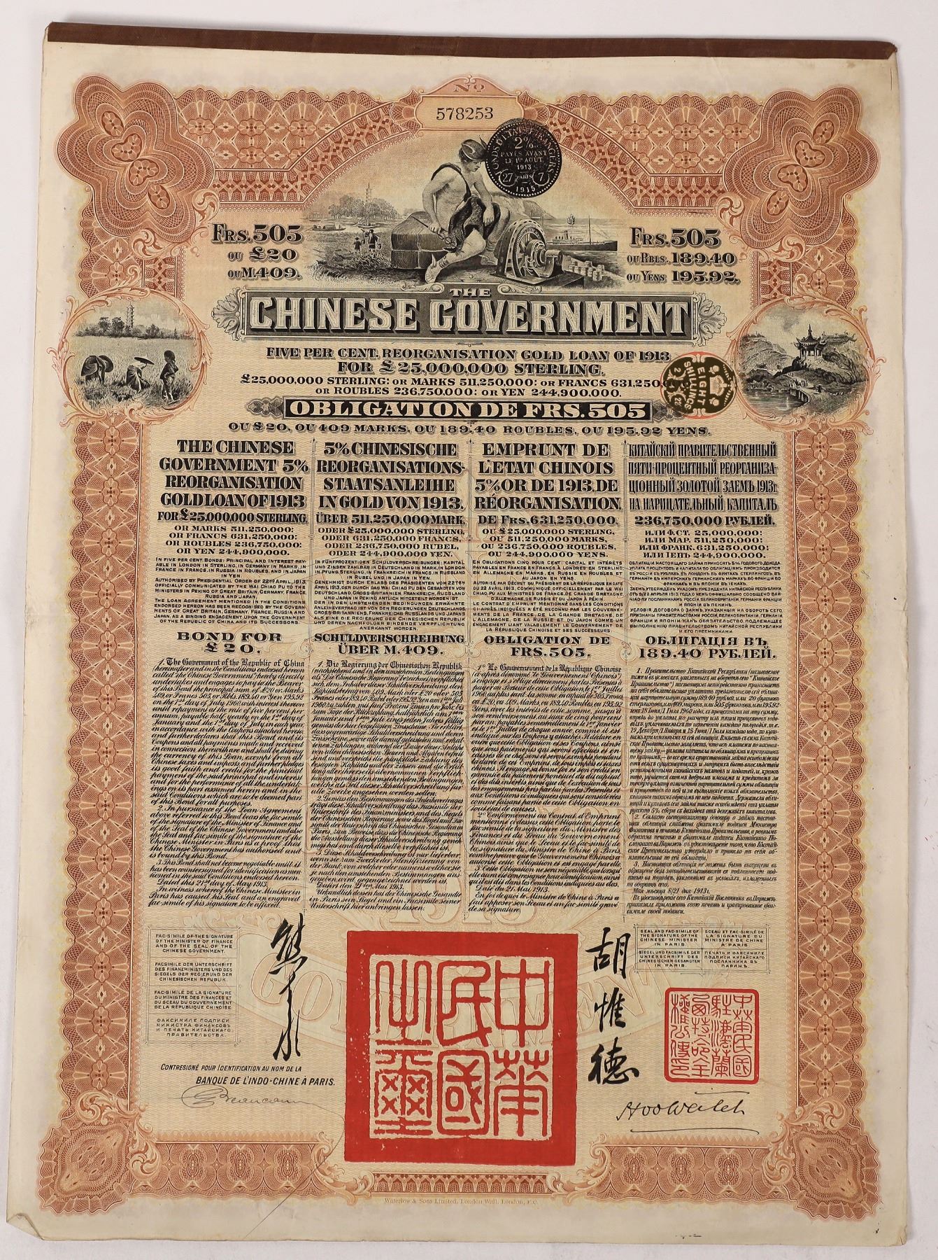 Beautiful 1913 Chinese Government 5% Gold Bearer Bond issued for 505 French Francs by the Russo-Asiatic Bank. Very nice vignettes and nice engraving job by Waterlow & Sons, Ltd., London. The Chinese government defaulted on these bonds in 1939, 21 years early. In addition to the missed dividends, the bonds are gold bonds which were priced when gold was $35 or less per ounce. This bond is being sold for it's collectible value only. The bond is a bearer bond which means that it is the property of whoever has it in possession. Condition is EF and this one is much better than the average condition on these. Would be beautiful framed. 43 Coupons are attached which is customary. China