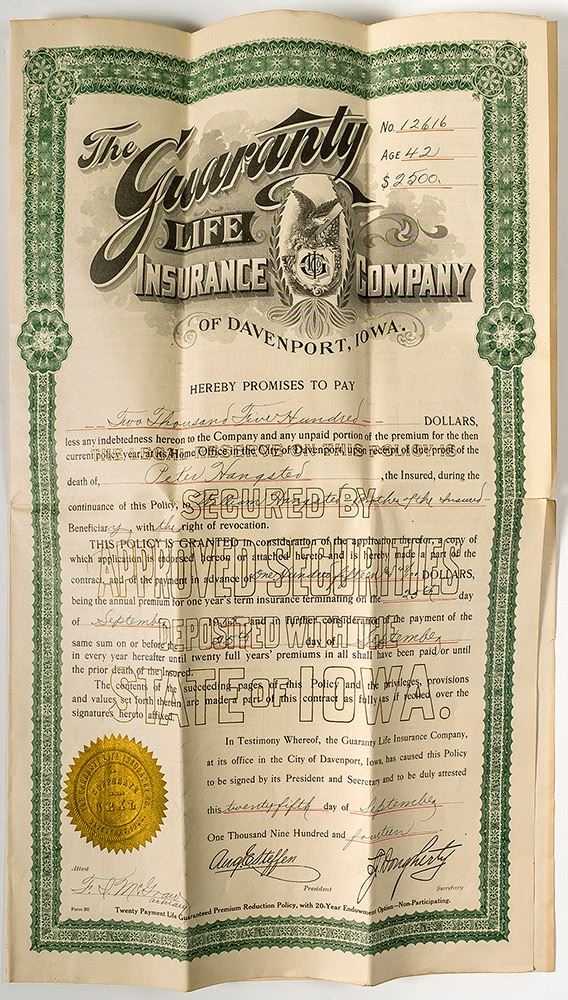 Peter Hangsted insured his life on September 25, 1914 for $2500. The policy opens to 12 x 19, with coupons on the interior. The only Peter Hangsted in the 1910 census lived in Union, Allamakee, Iowa. Date: 1914 Location: Union, Iowa HWAC # 45039
