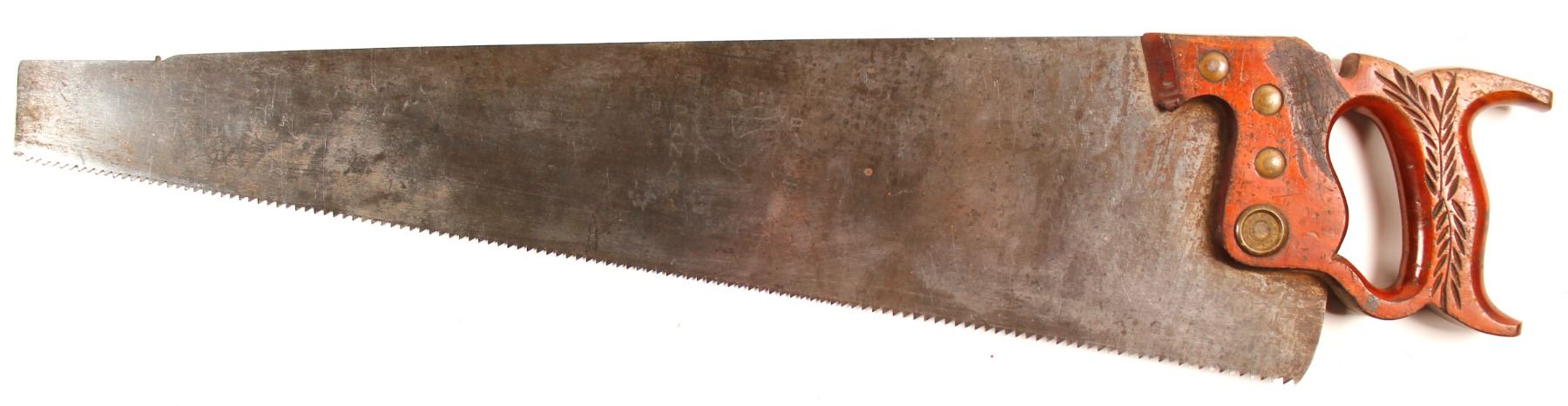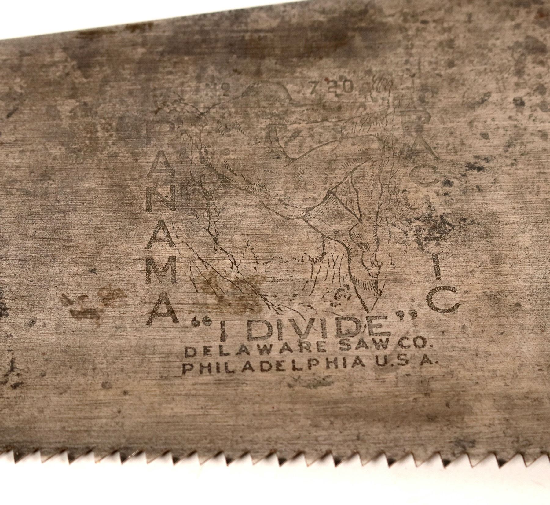 Brown wood handle hand rip saw, 30.5" long, 7" deep at its largest and 2" deep at the tip. The unique thing about this saw is it is from the Pan Pacific Expo, number 720 with quotes" I Divide Delaware Saw Company Philadelphia USA". Apparently this was a special saw made by the Delaware Saw Company for the Pan Pacific Expo to show off their wares in 1915 and extremely rare and unusual .