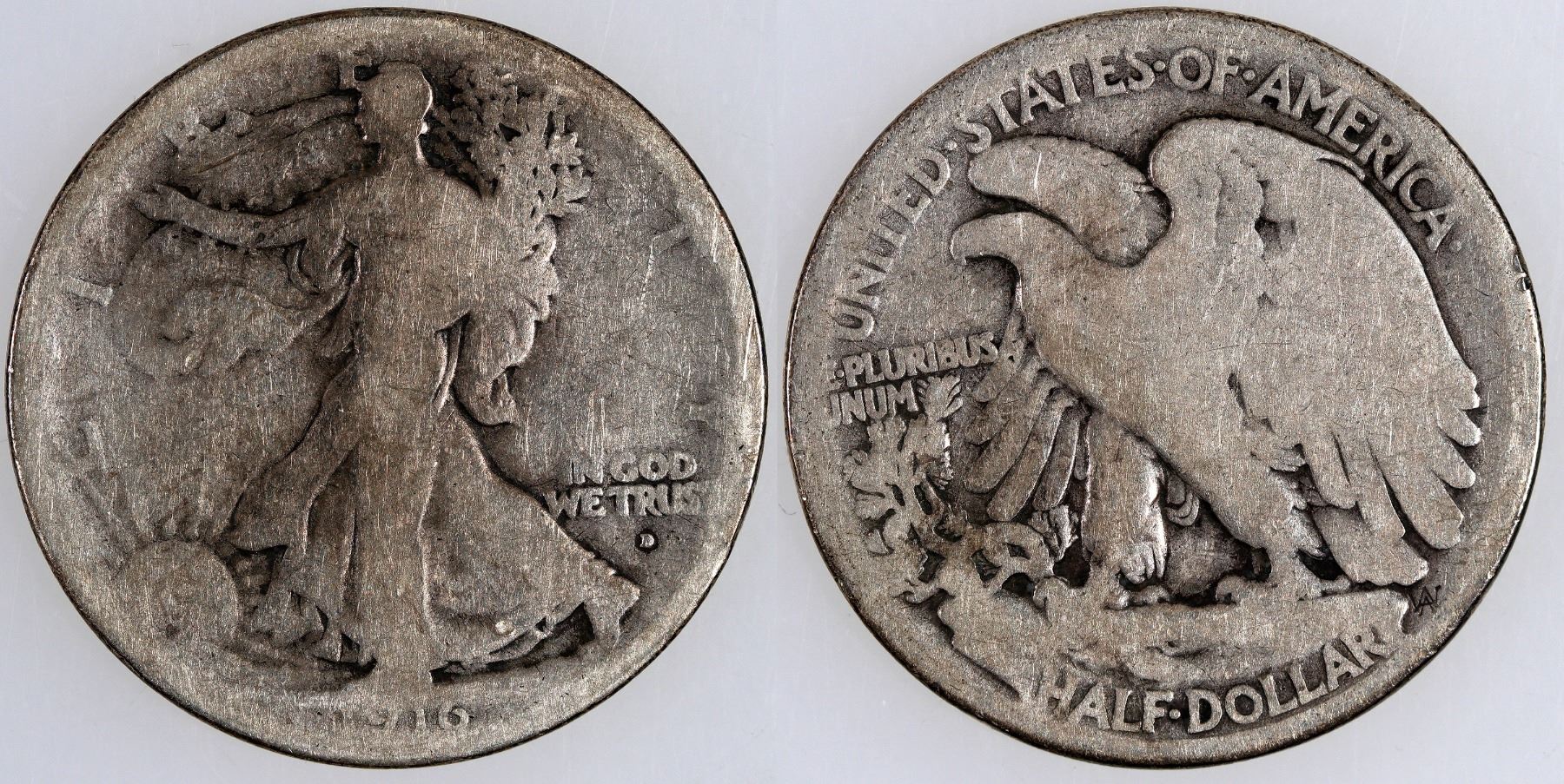 First year of issue, 1916-D Walking Liberty half dollar, AG 3 condition.