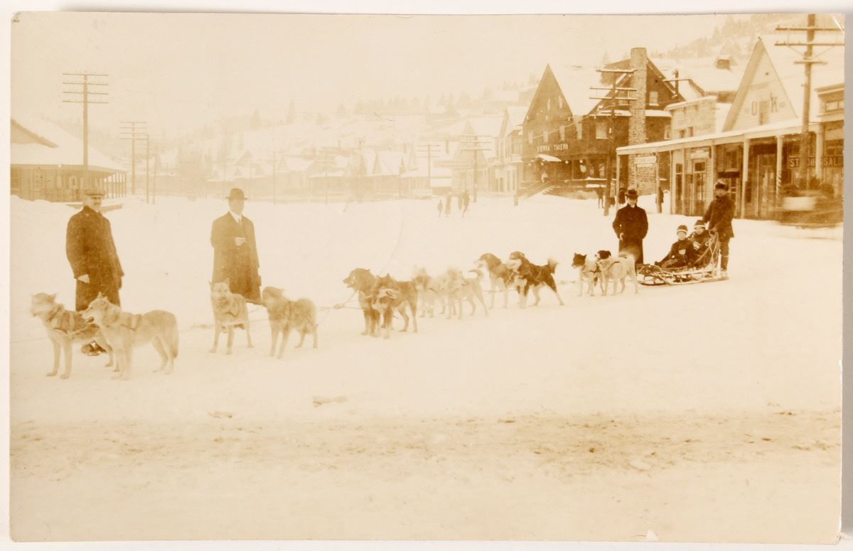 Postmarked Truckee. Twelve dog team. Taken on main street. Sierra Hotel is on right and train depot is on the left. City: Truckee State: California Date: 1922 ID# 44936
