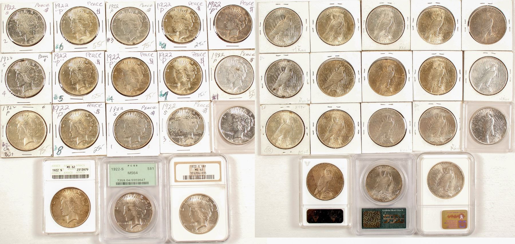 Lot of 18: three certified: MS 62, MS 63, MS 64. All the rest AU-BU. Date: 1922 Location: HWAC# 60528