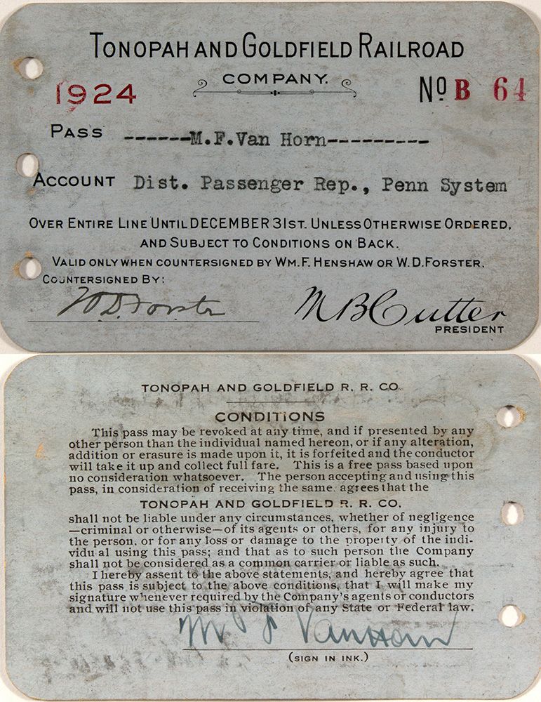 Pass no. B 64 issued to Mr. M. F. Van Horn, District Passenger Rep. for the Pennsylvania System. It has some wear including marks and three round hole punches on the left side.City: TonopahCounty: State: NVDate: