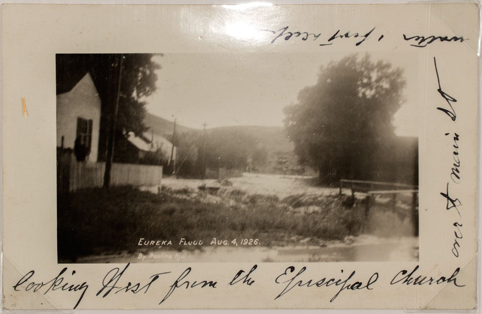 “Eureka is now recovering from a day of terror...” says the Nevada State Journal. Two Killed and $30,000 in damage from the cloudburst in Eureka Canyon. “The water from a cloudburst in the hills came rushing into the mining town and wrecked bridges, flooded cellars and washed out streets.” Main Street was damaged and the cloudburst left huge deposits of muck and mud. Eight bridges within the city limits were washed out. Stores and garages were flooded. This all took place in an hour! The photograph on this post card was taken by Pauline Hjul. Peter (grandfather) Hjul and Charles (father) Hjul family were long time residents and merchants of Eureka.