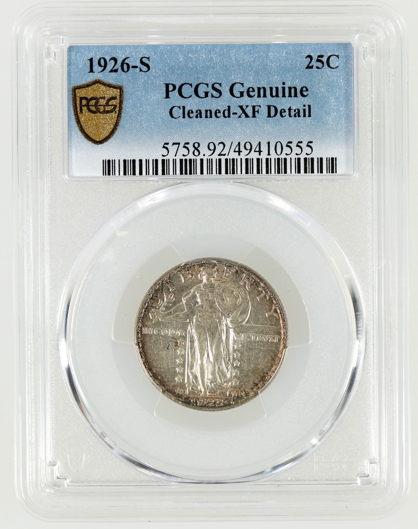 PCGS certified Genuine, cleaned, XF detail 1926-S Standing Liberty quarter.