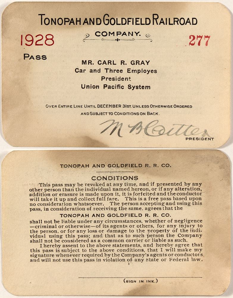 No. 277 issued to Mr. Carl R. Gray, Car and Three Employees. President Union Pacific System. The piece has some wear, including stains.
