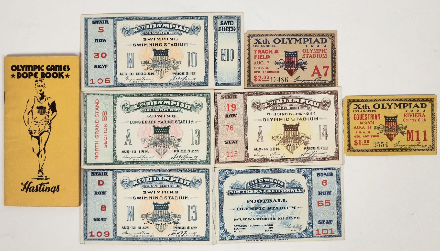 Very rare group! Lot includes seven tickets plus a booklet put out by Hastings. Tickets include: rowing at the Long Beach Marine Stadium, swimming (x2), Closing Ceremony, Equestrian sports, track and field, and football. The 1932 Los Angeles Olympics, held during the Great Depression, were the first Games on the U.S. West Coast and drew about 1,300 athletes from 37 nations. To cut costs, events were centralized at the newly built Los Angeles Memorial Coliseum, and the Games introduced the first Olympic Village to house male athletes. Despite economic hardship, the event was considered highly successful, showcasing American organizational ability and setting traditions that shaped future Olympics.