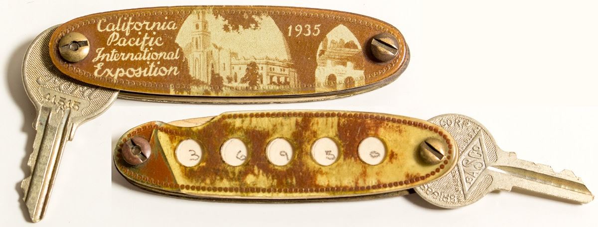 A promotional 3" folding knife from the 1935 California Pacific International Expo. Currently missing blade and there is a key on the screw instead. The handles of the knife are in good condition, one with the vignette of a California Missionary and the other has an oil change mileage reminder. City: State: Date: Inventory# 38544