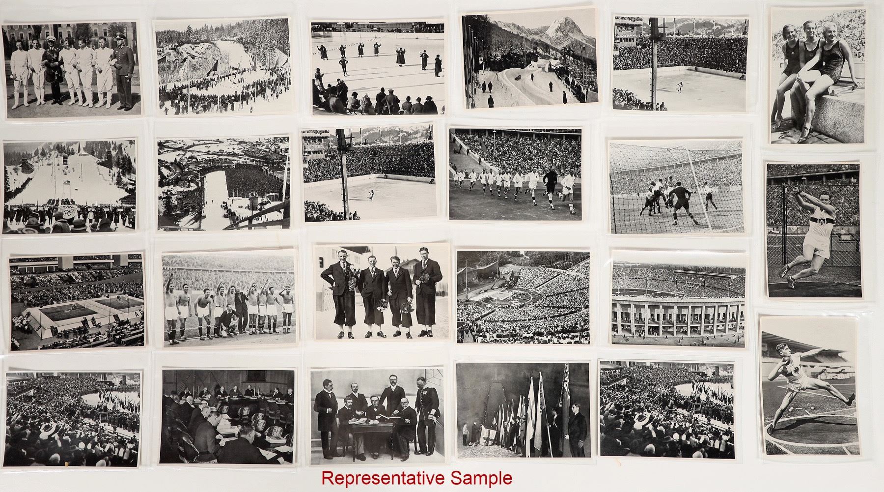 Lot of 122 black and white photographs (4.75 x 6.75") from the winter games at Garmisch-Partenkirchen and summer games at Berlin. Descriptive text in German on the reverse. Hitler wanted to outdo the 1932 Los Angeles games and use the 1936 games to promote his government and ideals of racial supremacy and antisemitism.