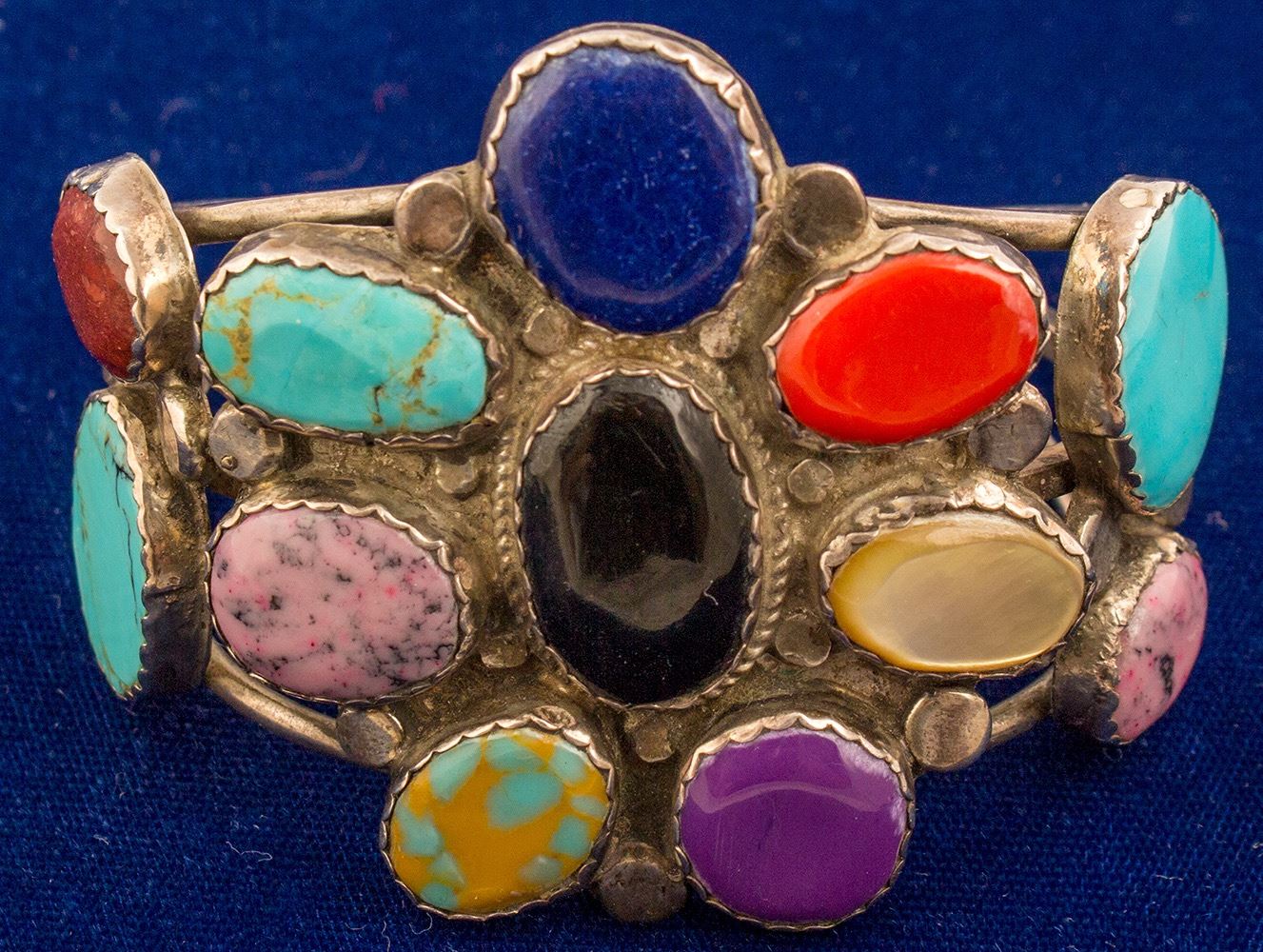 Early Sterling Silver bracelet with 12 multicolored stones including turquoise. 2.25" x 3". Consigned by The Cowboy Connection in Livingston, MT. State: City: Date: ID# 49251