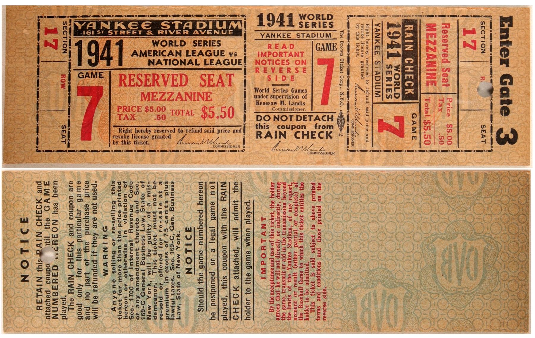 This is a 1941, Full, World Series Ticket for Game 7. Ticket is full. Ticket is for Section 17 at Yankees Stadium. Bottom right corner in reverse has wear. Lots of wear along the front, left edge. Various smudges throughout the front of the ticket.