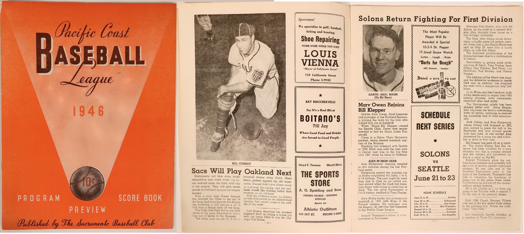 The competition for that game was Portland and the scorecard has been completed by the fan who had the program. Article on manager Earl Sheely. Articles on Jo Jo White and Jerry Staley. Cover has 1/4 tear at top of spine. Very good condition with no major issues.