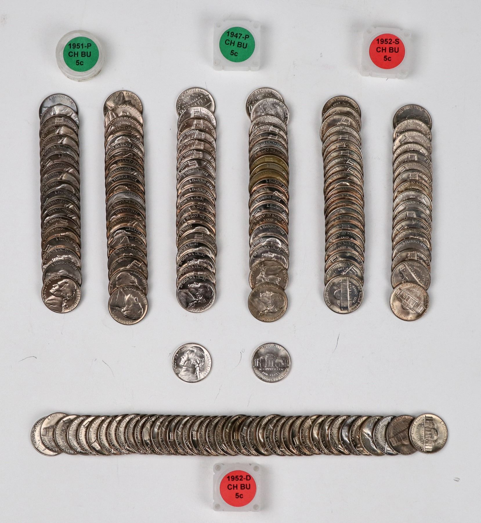 4 rolls of choice BU Jefferson nickels: 1947-P; 1951-P; 1952-D; 1952-S. [] [] [] [] []