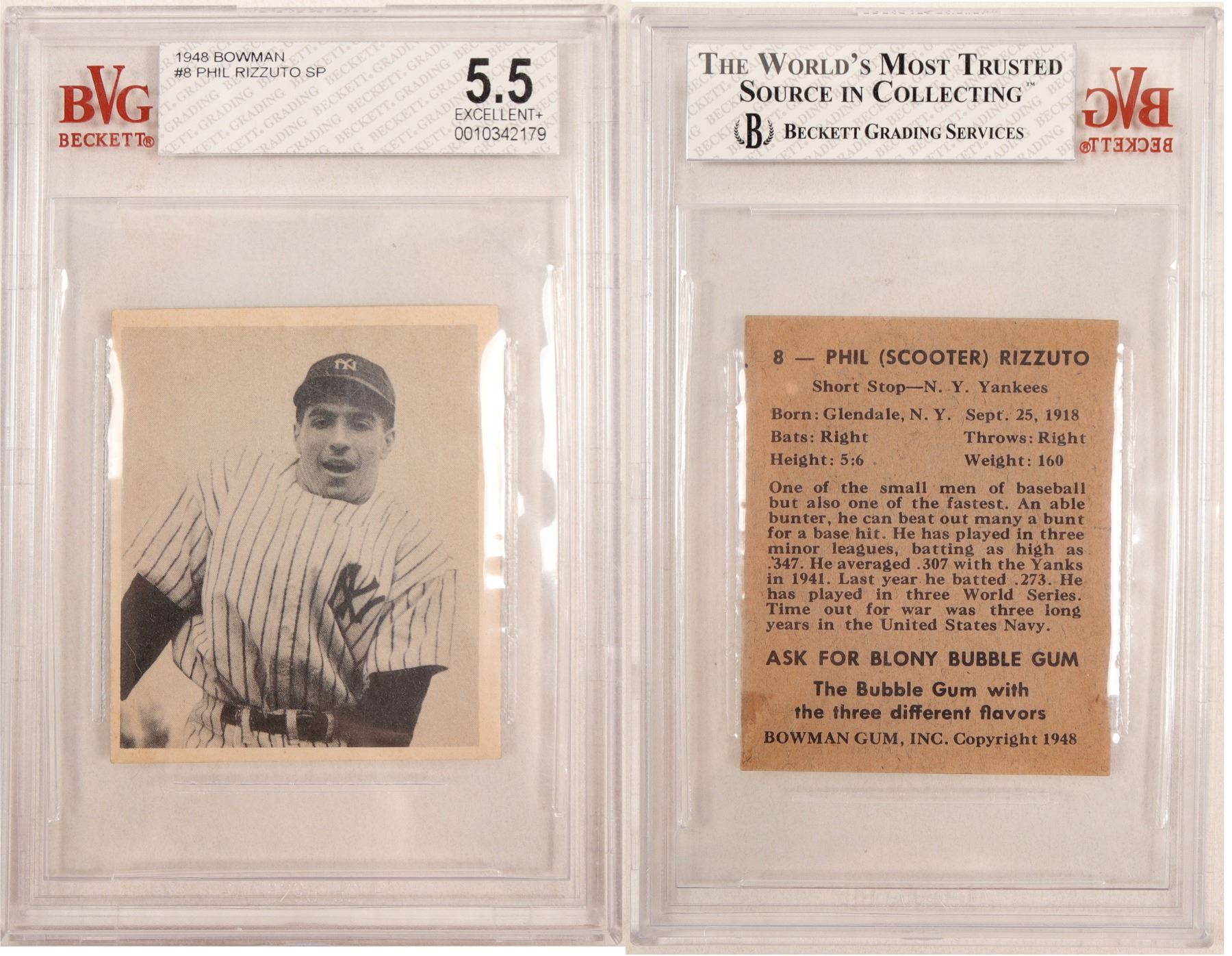 This is a #8 1948 Bowman Phil Rizzuto Rookie Card. Front shows what looks to be "Scooter" going for a grounder. Back has Scooter's stats. On back side, there are two smudges. One in the top left and other on the bottom left of back side. A bit off center. All four corners and edges have minute wear. There are 136 of these made (PSA). Beckett rating is 5.5. Beckett Certification: 001342179.