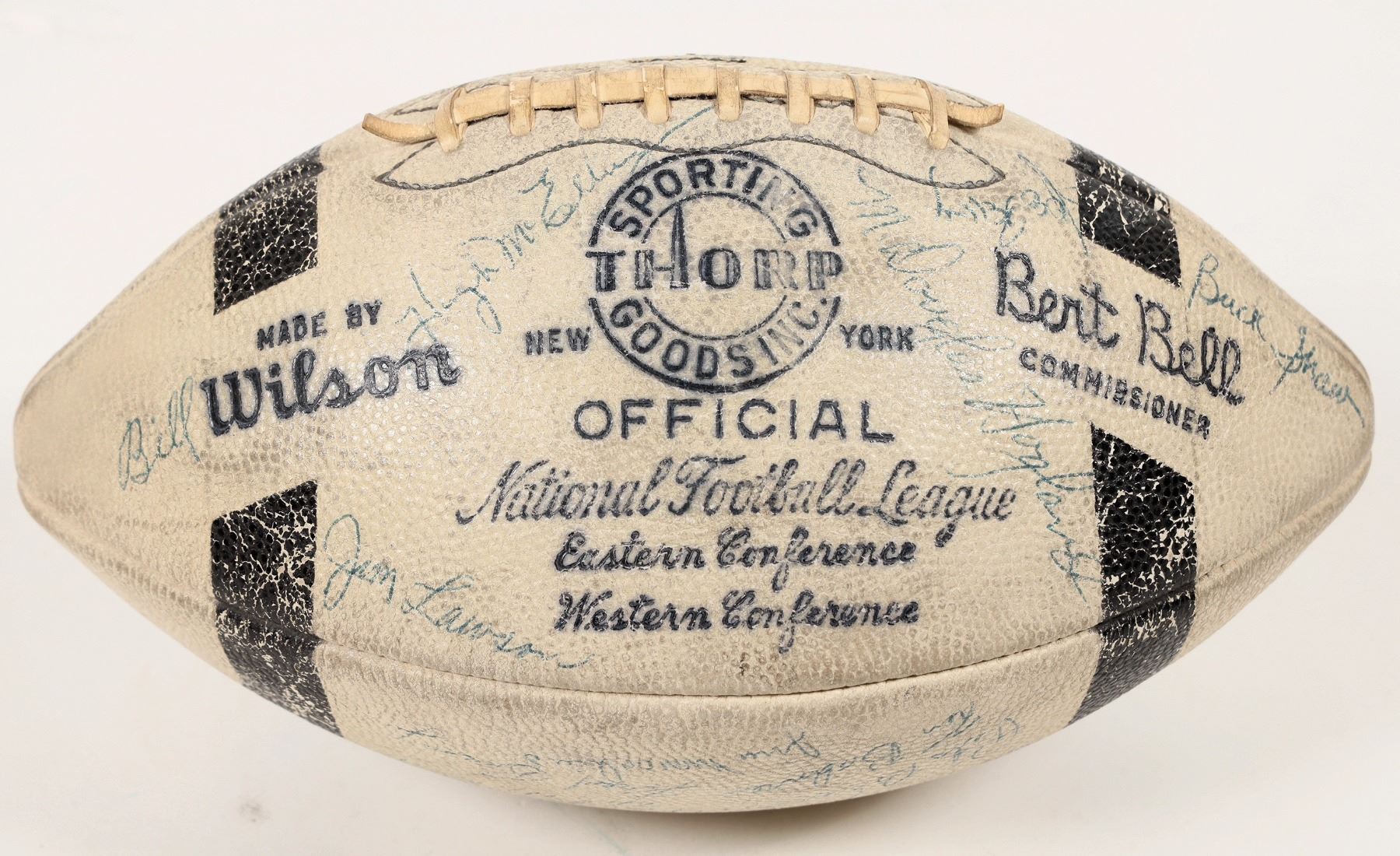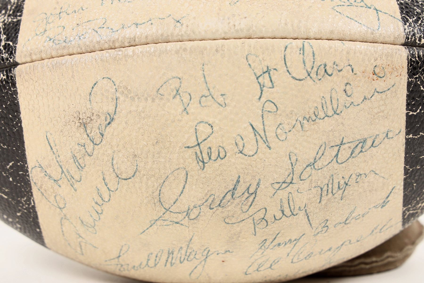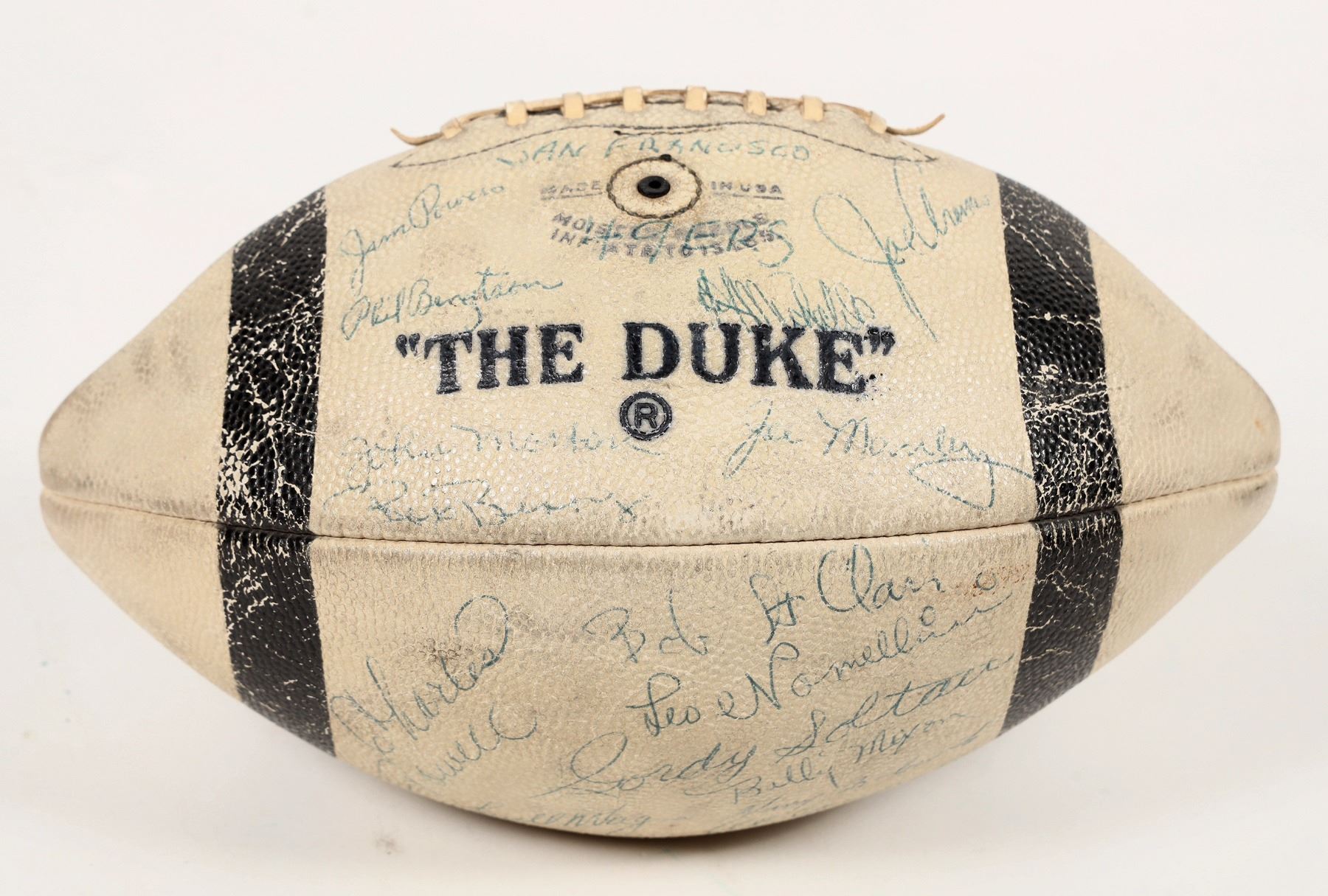 1953 49er's Autographed Football signed by Hugh McElhanny, Hall of Fame halfback. Gordy Saltau, Pro Bowl wide receiver. Y.A Tittle, Quarterback 2100 yards and 20 touchdowns. Joe Perry, Hall of Fame fullback. Bill Wilson, wide receiver led the team in receptions, yards and touchdowns. Bill Johnson, Offensive line Pro Bowl Under Coach Bill Shaw had a 9-3 season record, led the entire league in point scored, but missed the playoff by losing both of their games against the Detroit Lions, placing 2nd.NFL Western