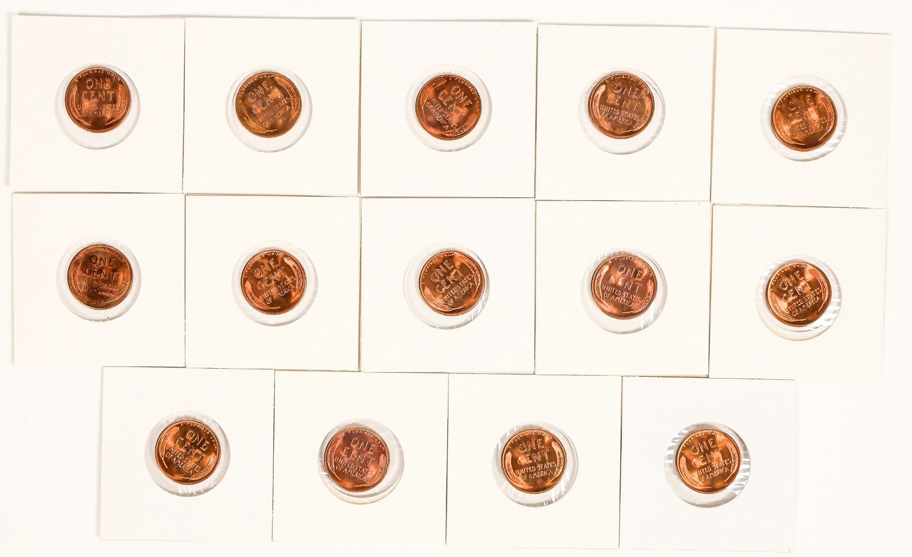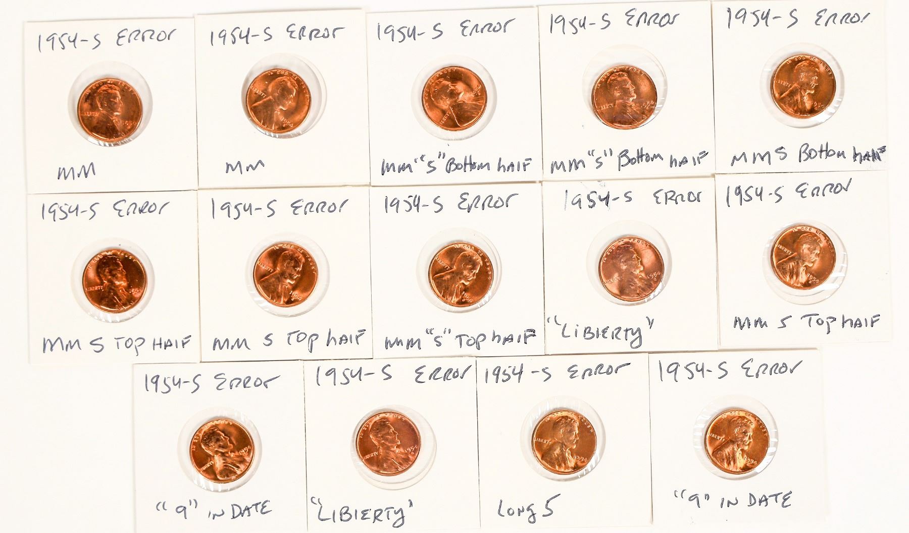 Fourteen brilliant uncirculated 1954-S Lincoln cents, all error coins: elongated dates, mint mark placement, Liberty blotched, etc. Each stapled in a cardboard 2 x 2.