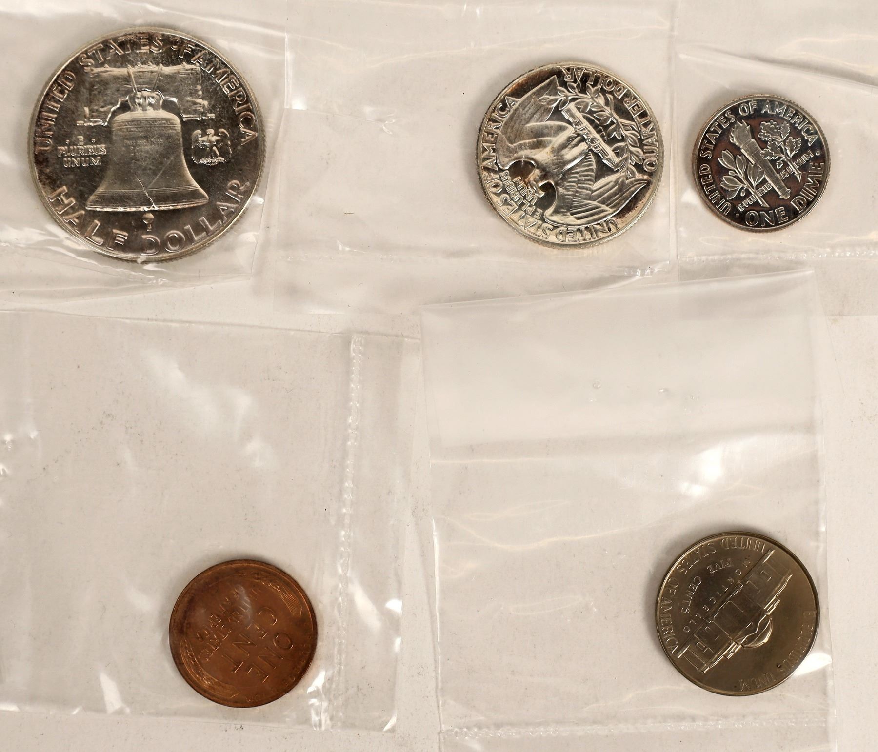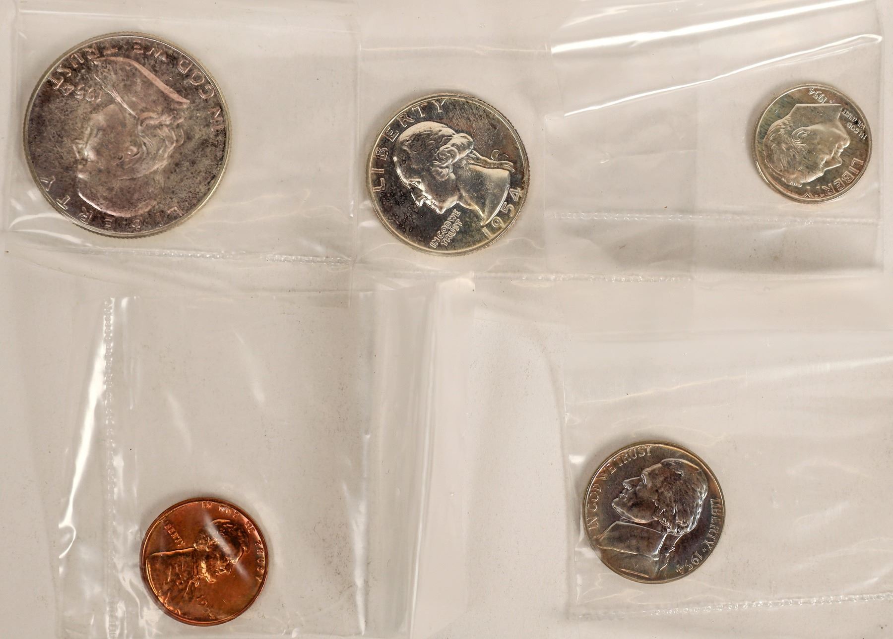 In original box, one of the 233,300 proof sets made by the U. S. Mint in 1954. Five coins: penny, nickel, dime, quarter & half dollar.