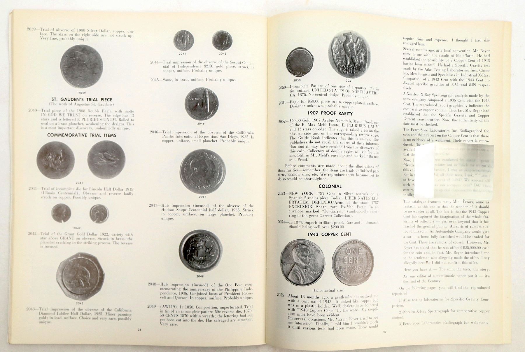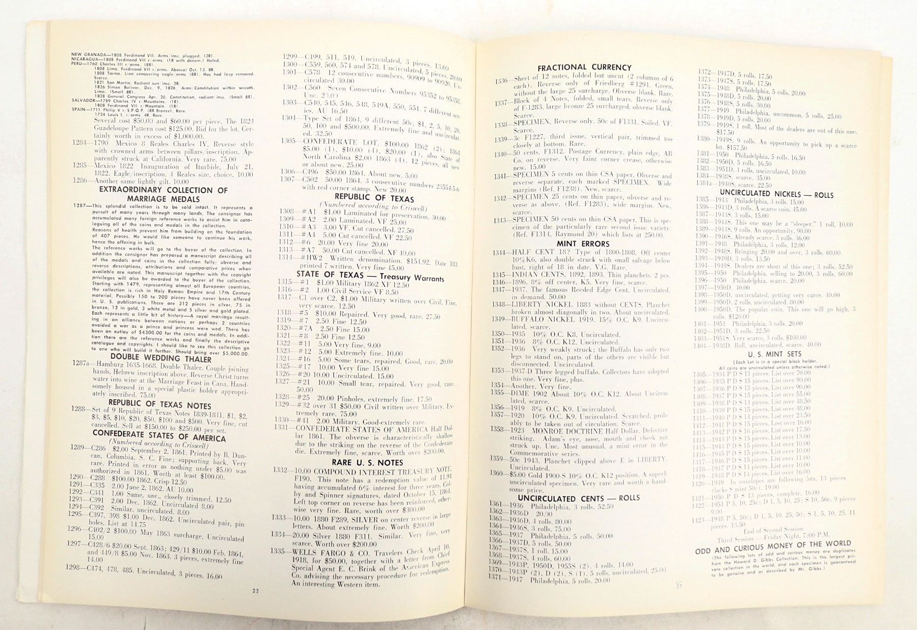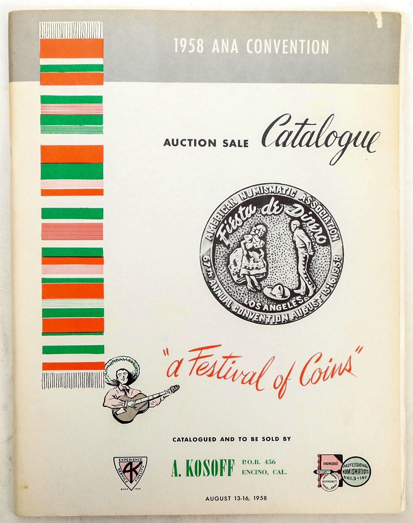 "A Festival of Coins," held at the Golden State Room of the Hotel Statler, Los Angeles, August 13-15, 1958 by Abe. Kosoff. Includes prices realized. Lot 1660: Wass Molitor $50 slug: $6400. Lot 1678: 1794 uncirculated silver dollar: $7750. Lot 1945: $4 gold Stella 1880: $4650. Errors, patterns, and more.