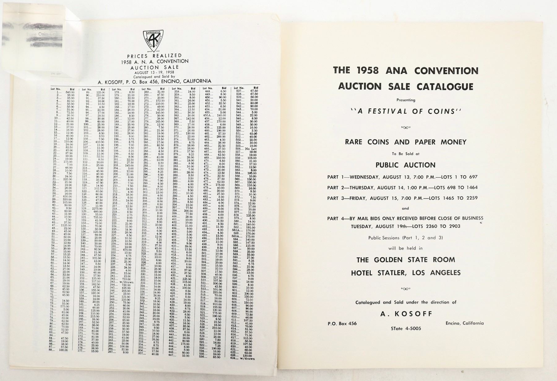 "A Festival of Coins," held at the Golden State Room of the Hotel Statler, Los Angeles, August 13-15, 1958 by Abe. Kosoff. Includes prices realized. Lot 1660: Wass Molitor $50 slug: $6400. Lot 1678: 1794 uncirculated silver dollar: $7750. Lot 1945: $4 gold Stella 1880: $4650. Errors, patterns, and more.