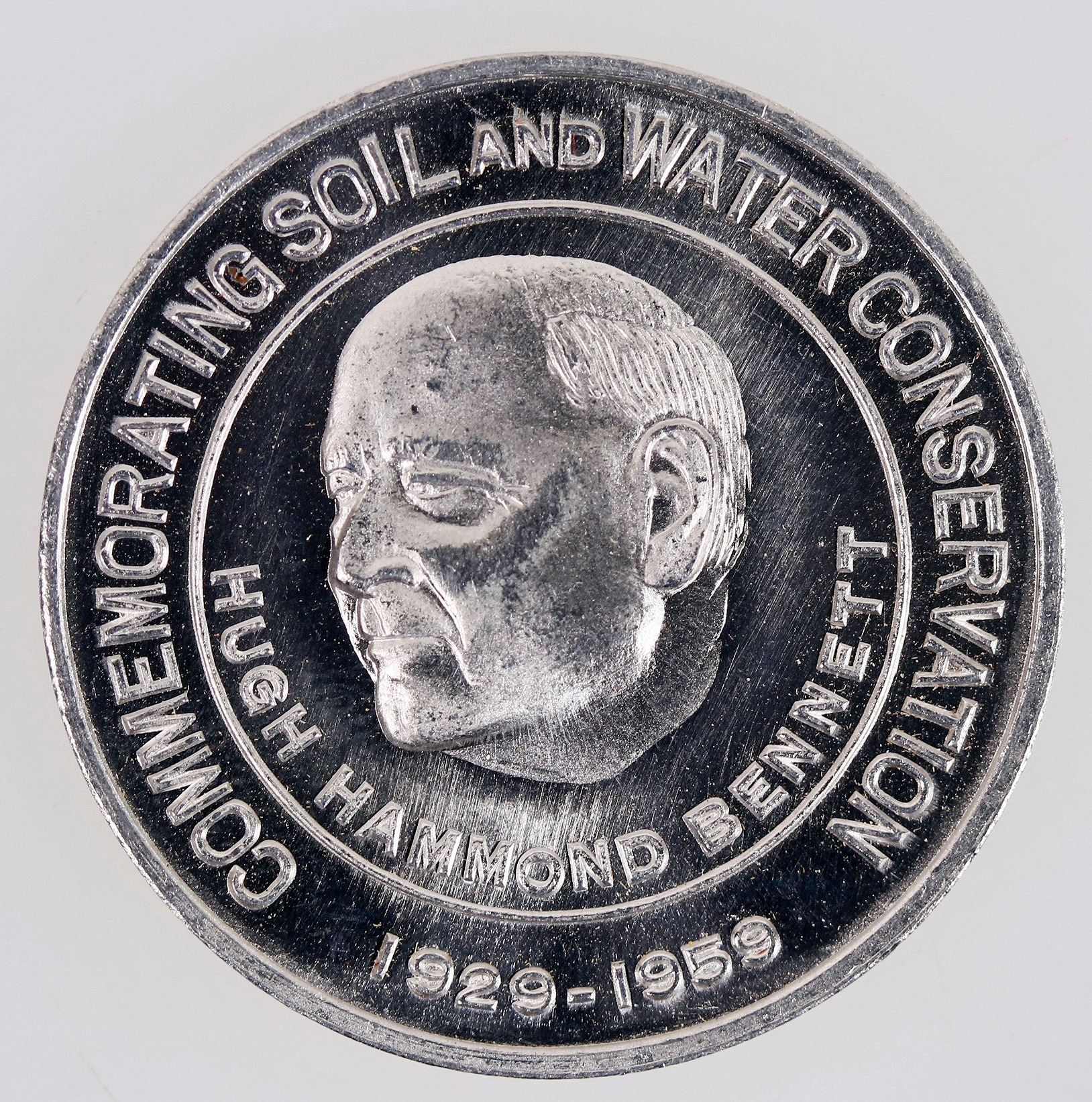 HK-574C. Aluminum. Produced by Russel Fister in 1959 who had worked with Dr. Bennett while he was superintendent of the Osage Indian Agency. Struck by Wendell-Northwestern, in metal finishes similar to the '59 International Petroleum Centennial medals also produced by Fister, and struck by Wendell-Northwestern. Very rare and unusual piece, please review.