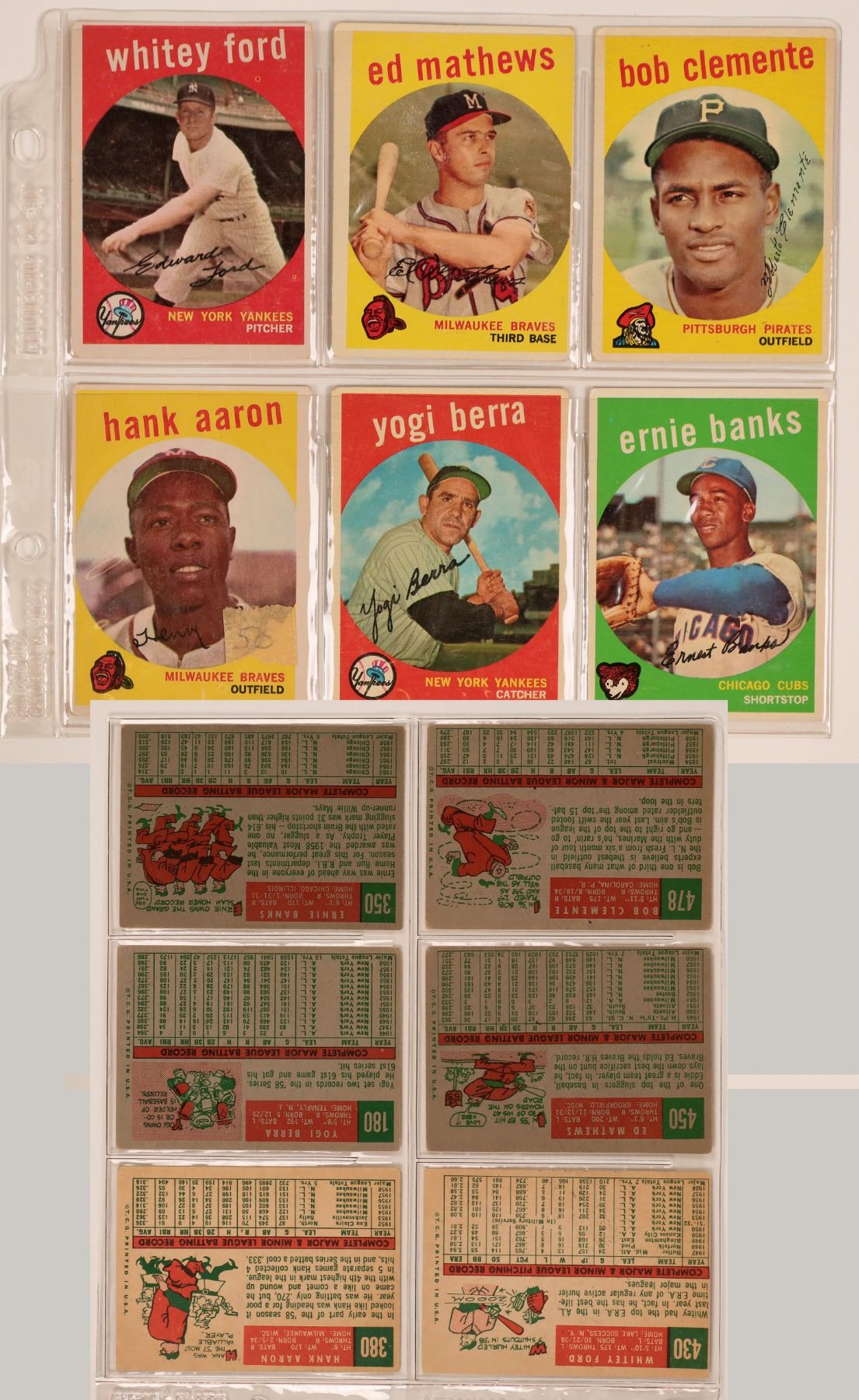 Great set of 1959 cards includes Whitey Ford, Ed Mathews, Bob (Roberto) Clemente, Hank Aaron, Yogi Berra and Ernie Banks. All in very nice condition and all in the Baseball Hall of Fame at Cooperstown. View closeups to inspect.