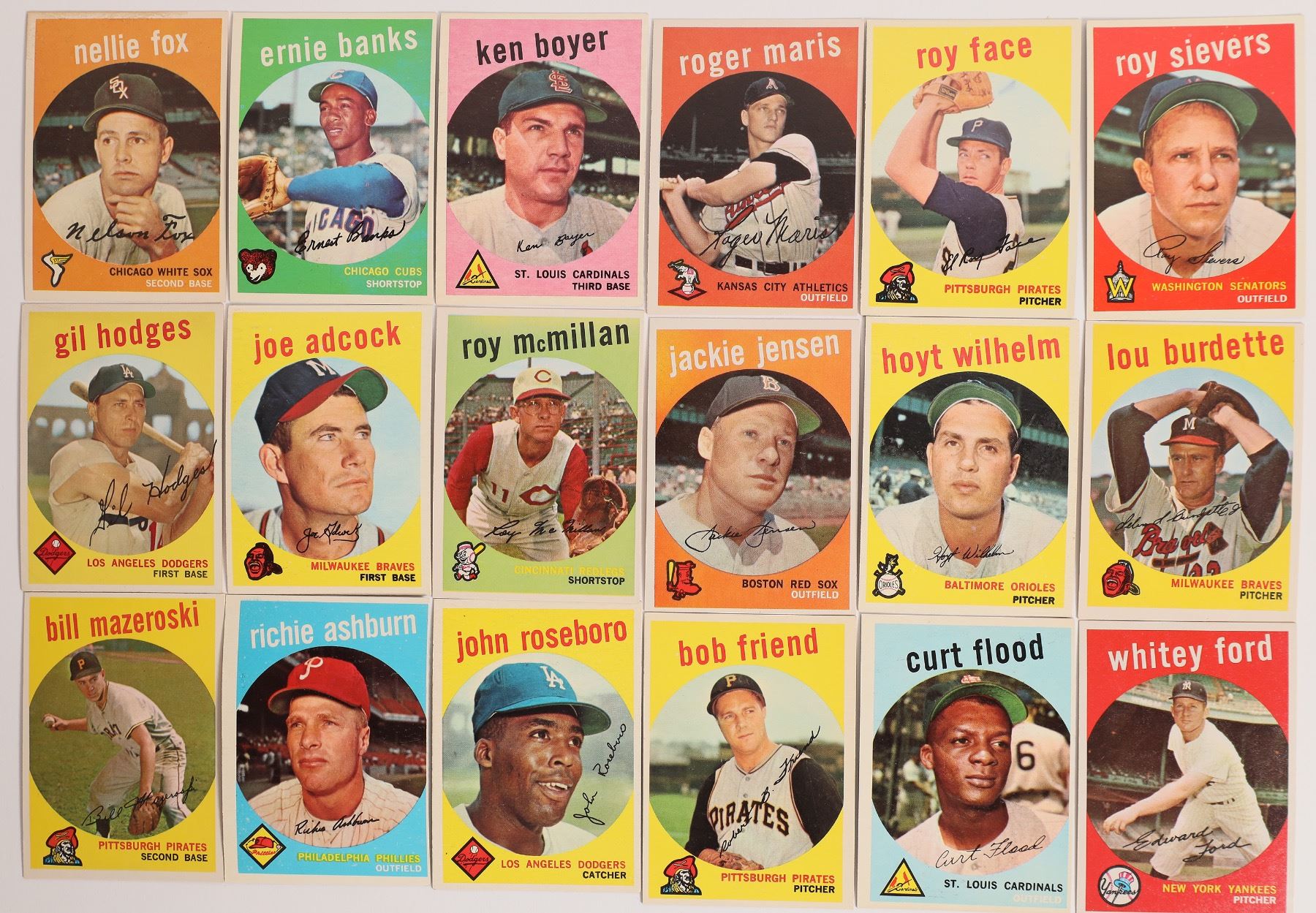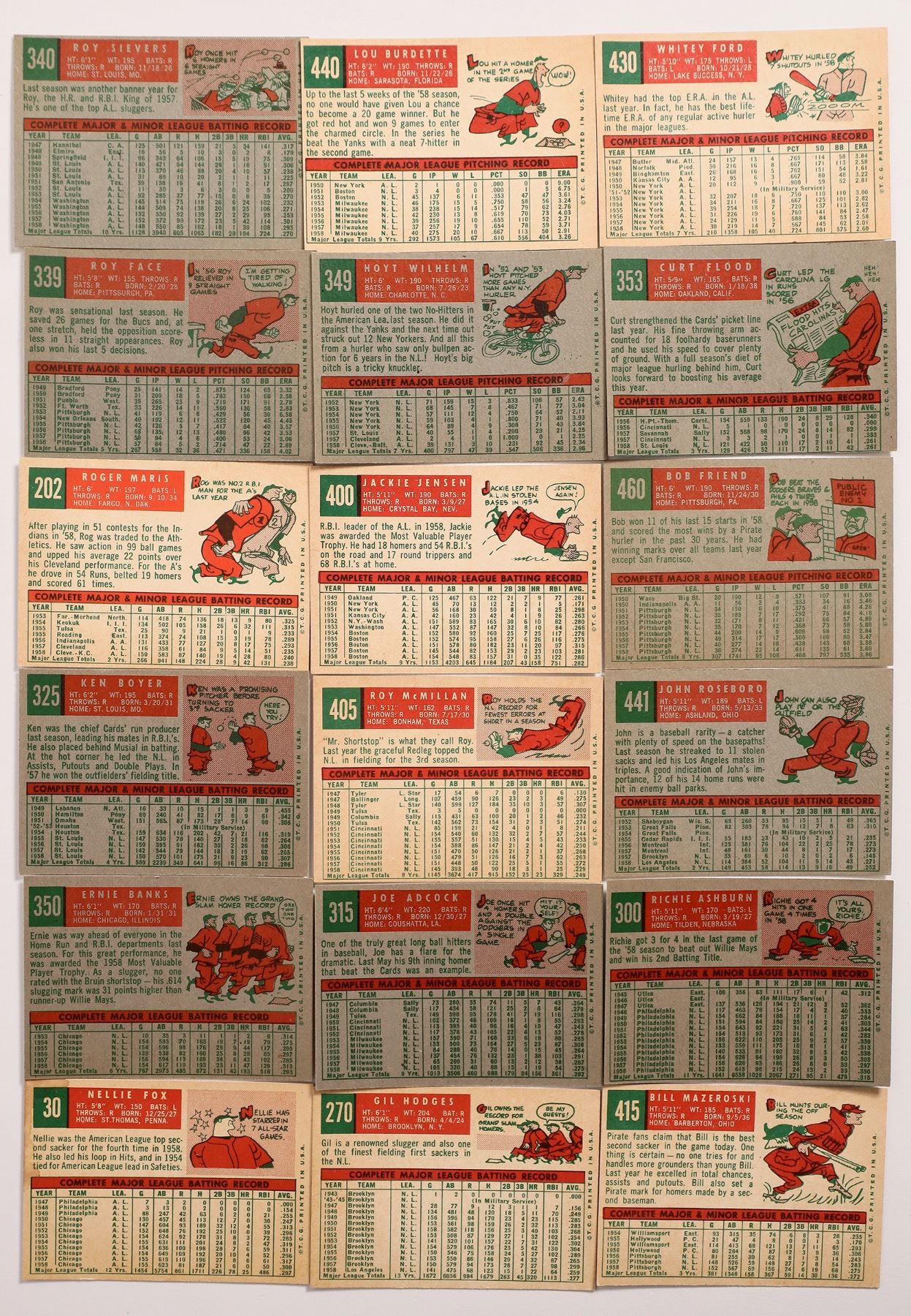 Includes Joe Adcock, Ernie Banks, Richie Ashburn, Whitey Ford, Nellie Fox, Bill Mazeroski, Bob Friend, Jackie Jensen, Roger Maris, Roy Sievers, Gil Hodges, John Roseboro, Hoyt Wilhelm, Roy McMillan, Ken Boyer, Lou Burdette, Roy Face and Curt Flood. Border condition varies, but most are extremely fine. No corner wear! Fox has a little light discoloration on top. Overall a great group for a now or experienced collector!
