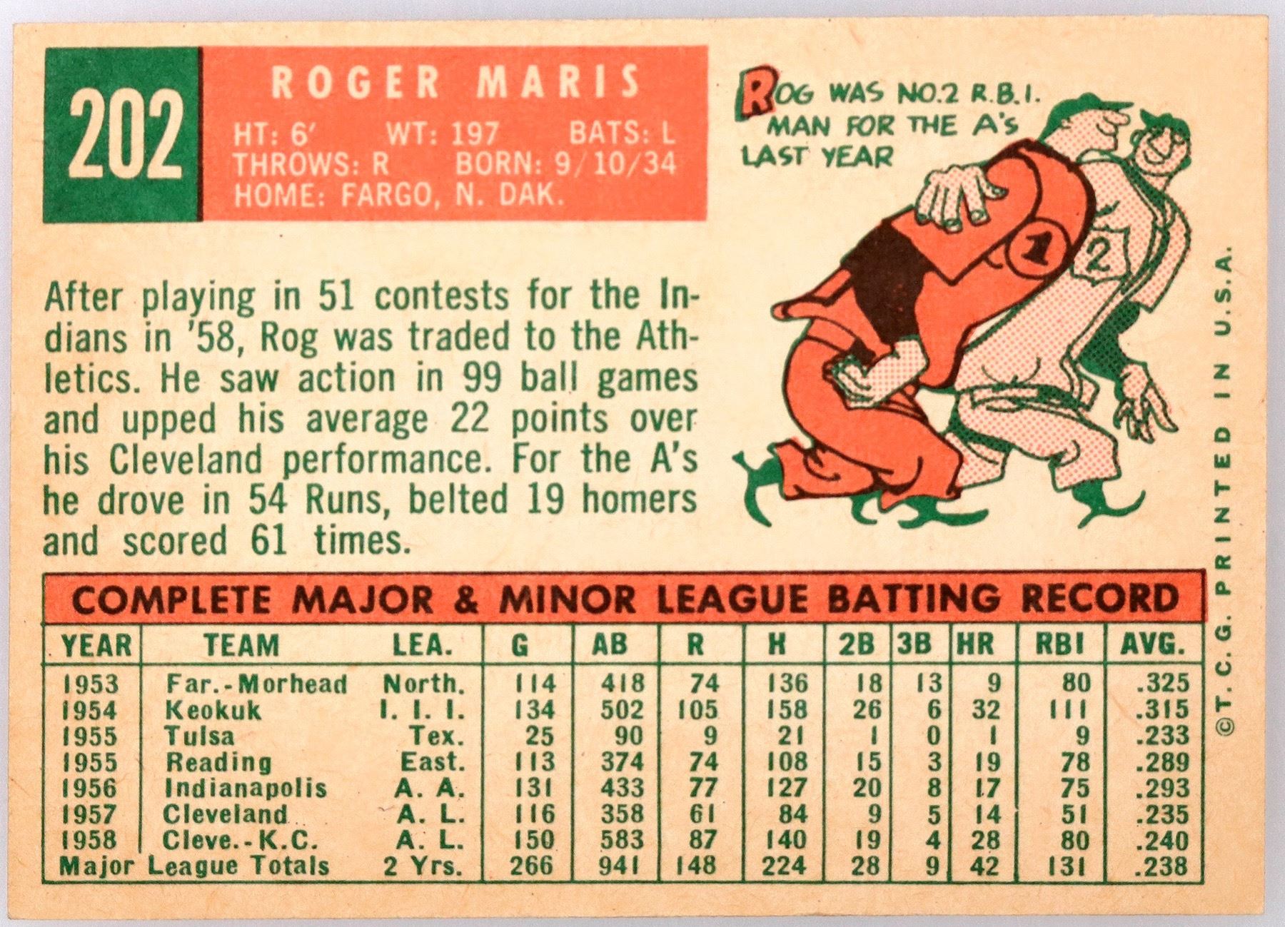 #202. Second year Maris card. Kansas City Athletics. Strong corner and edges. Border is nice; not perfect. Maris would soon be a Yankee and hit 61 home runs!