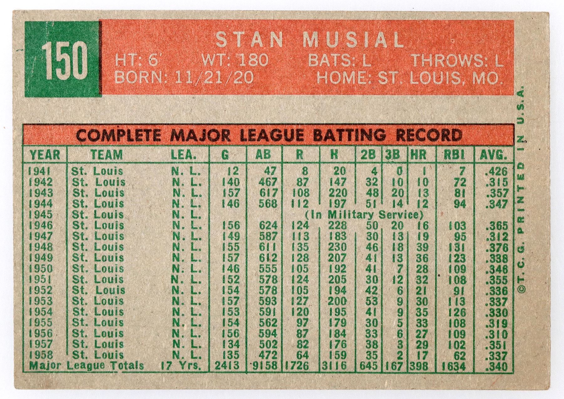 Musial did not have a card from 1954 to 1957. # 150. Very good corners. Excellent border. See photo.