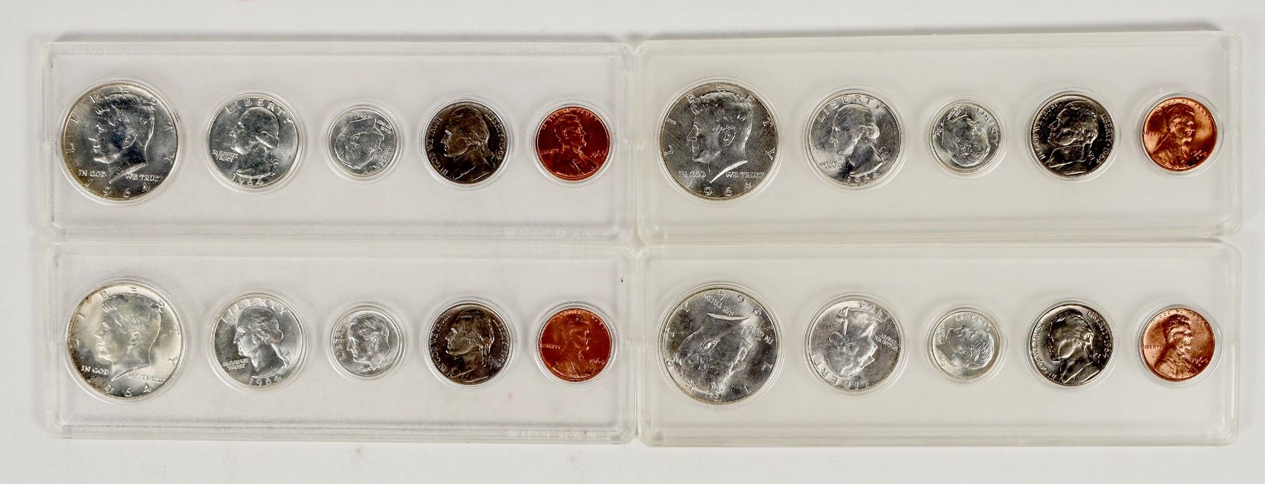Four 1964 U.S. coin proof sets, five coins each, in hard plastic cases. All problem free coins.
