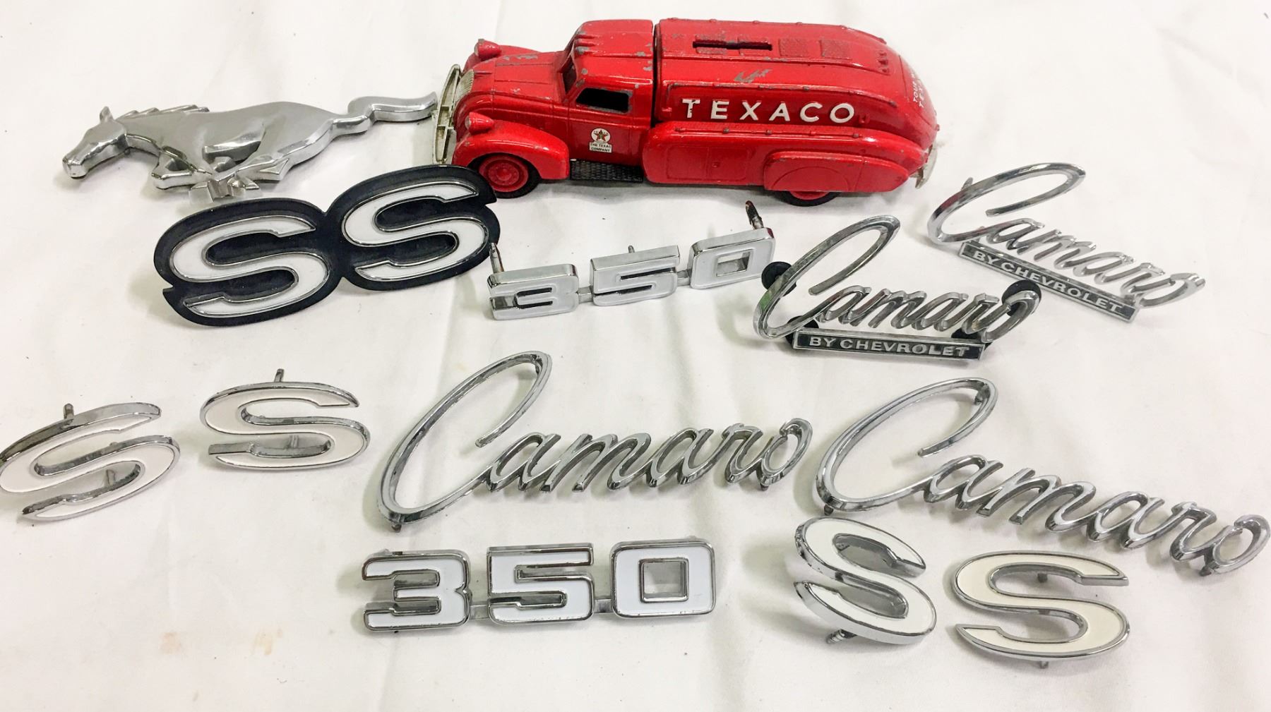 Mostly original Chevy 1969 Camaro SS body insignia's. 2 6" script Camaro, 2 4" script Camaro by Chevrolet-1 probably not original 1 has broken post, 2 white 350-1 has missing post, 5" white SS on black, 4 white S's-1 non original. Bonus 6" Mustang horse emblem and replica Texaco bank.