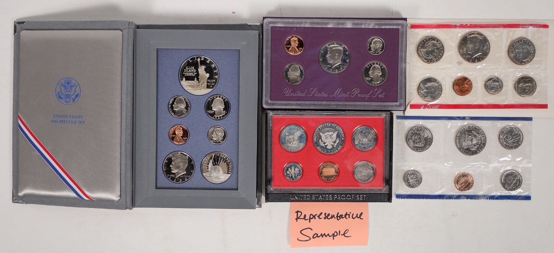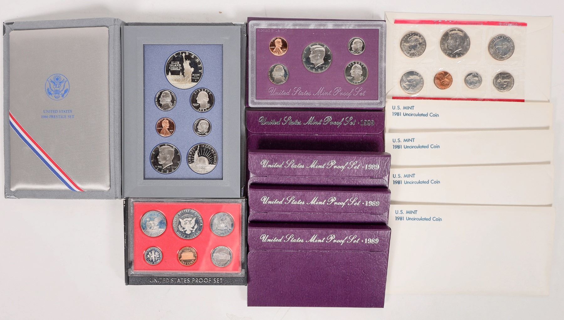 Twelve U. S. government issued sets from the 1980s: 1980 six coin Proof set; 1981 Uncirculated coins, five sets of 13 coins each; 1986 Prestige Set, seven coins including the Statue of Liberty silver dollar; 1989 Proof sets (5 five coin sets).