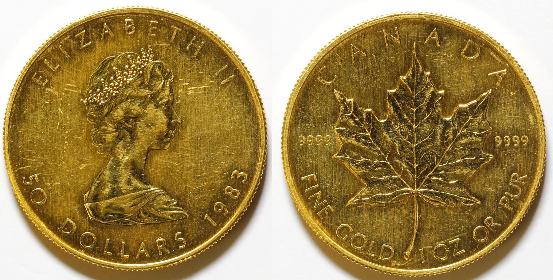 1983 $50 Gold Canadian Maple Leaf coin, uncirculated condition 1 Tr Oz 9999 Au. Date: Location: Canada HWAC# 75916