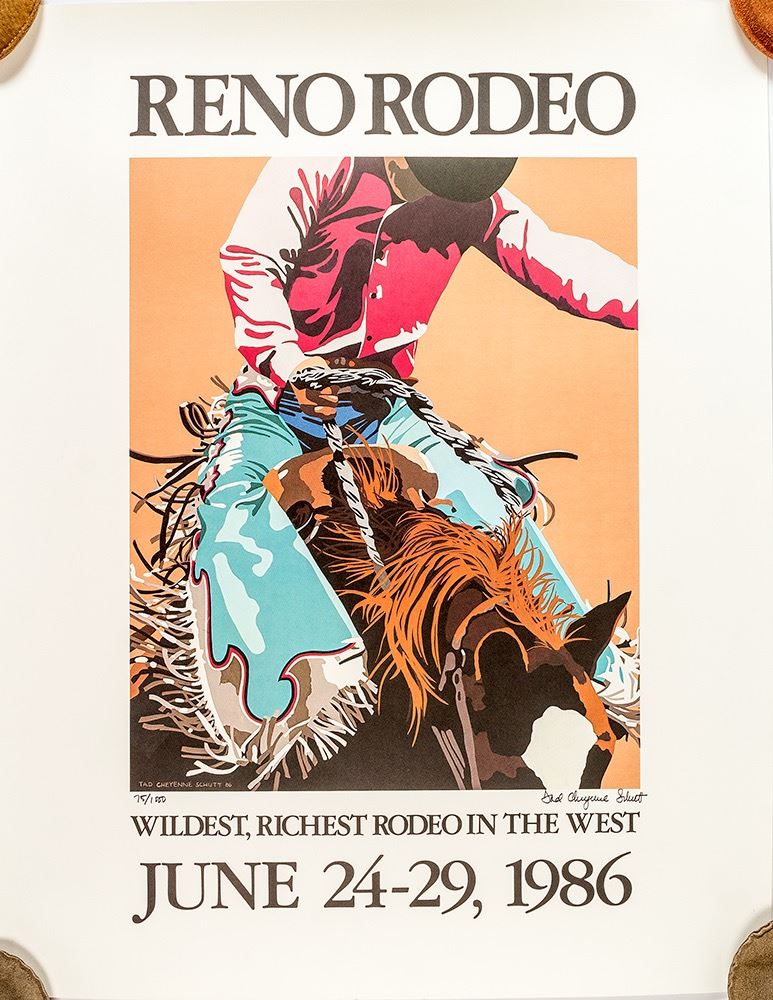 Unframed poster on heavy stock. RENO RODEO/ WILDEST RICHEST RODEO IN THE WEST. JUNE 24-29, 1986. Signed by artist Tad Cheyenne Shutt '86. 75/1000. Depicts a cowboy on a horse. State: City: Date: ID# 50230