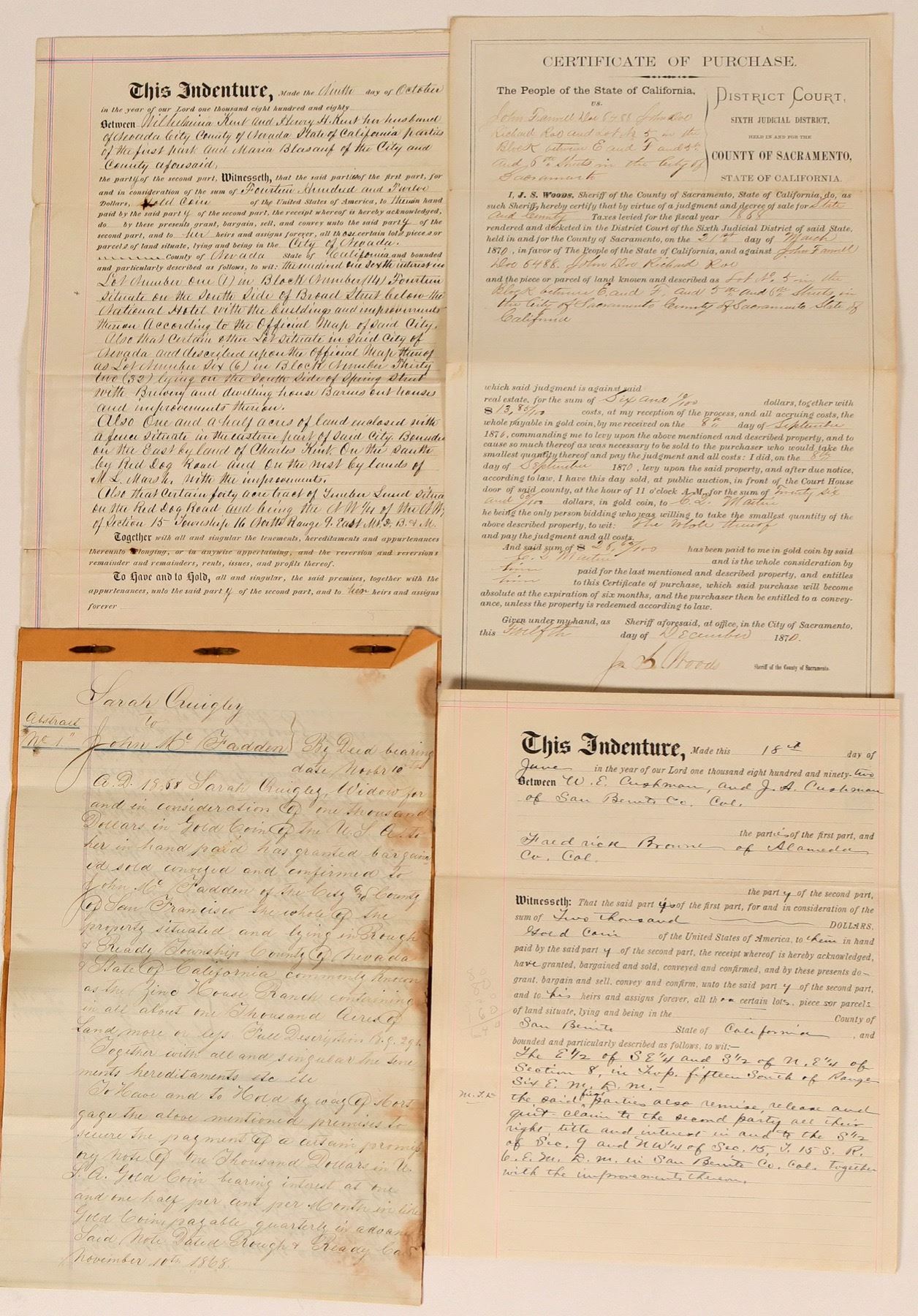 Lot of 5. 1) 1868, Declaratory Statement for Cases where the Land is not subject to Private Entry, BF Moore, Stanislaus County, settled and improved 160 acres. 2) 1868, Certificate of Purchase, lots purchased in Sacramento. 3) 1870, Abstract of Mortgage, Sarah Quigley of Nevada County, Zinc House Ranch, Rough & Ready. 4) 1880 Deed, lots in Nevada City, Nevada County. Involves Maria Blasauf, who established the Blasauf Brewery in Nevada City. 5) 1892 Deed, land sale in San Benito County.