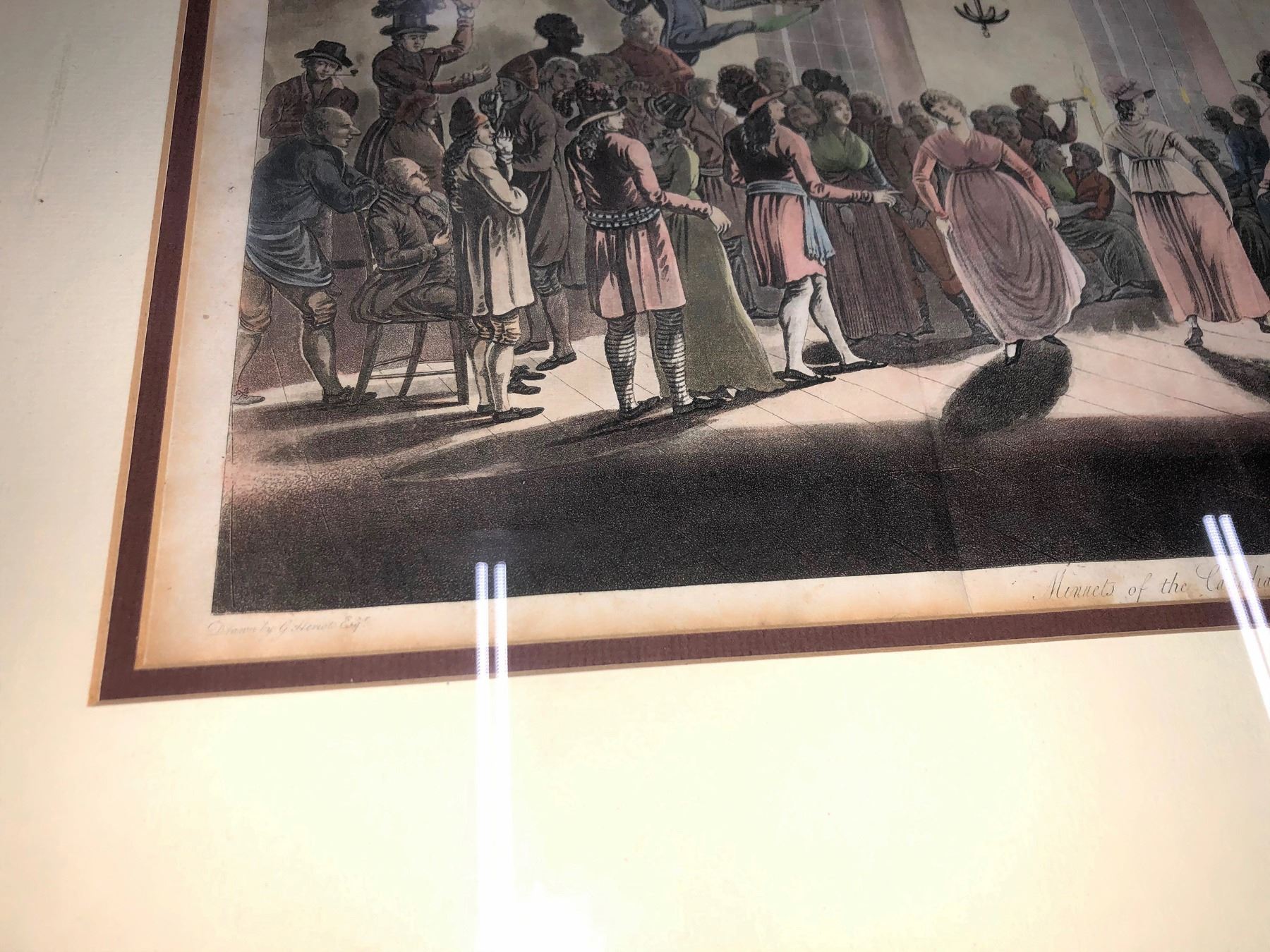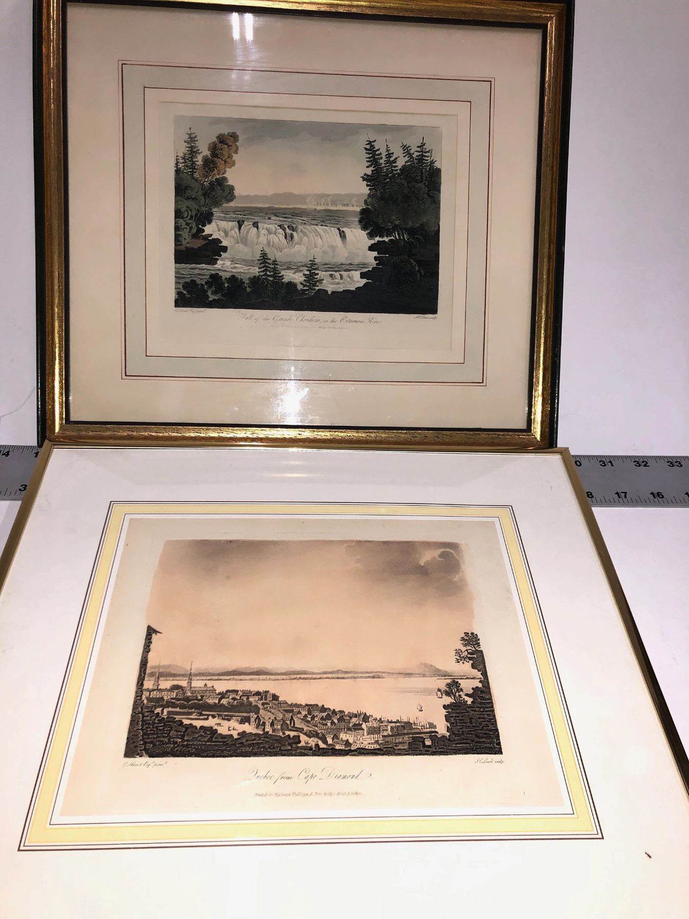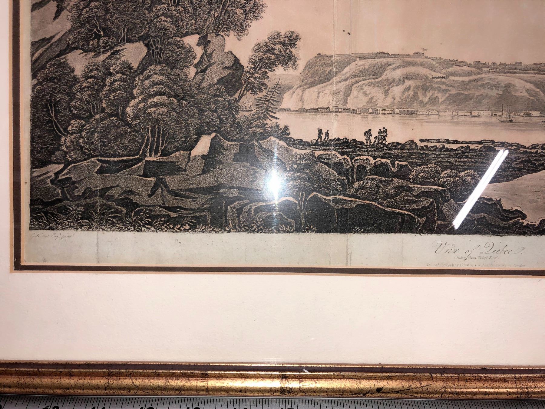 overall framed size is about 15 x 13" print size is generally 6x8." Handcolored. Includes Québec by Bouchette; New Bridge on the River Jack Cartier by Hiroet; View on the Upper Lake St Charles near Quebec by Heriot; Quebec from Cape Diamond by Heriot; Fall of the Grand Chandiere on the ontaoanias river by Heriot; View at St Pauls Bay on the River St Lawrence by Heriot; View of Quebec taking from point Levi 19.5 x 10.5" by Heriot; Minnets of the Canadians by Heriot framed 22.5 x 18"; L Danse Ronde 22.5 x 18 Circular Dance of the Canadians. In fancy maple frames.