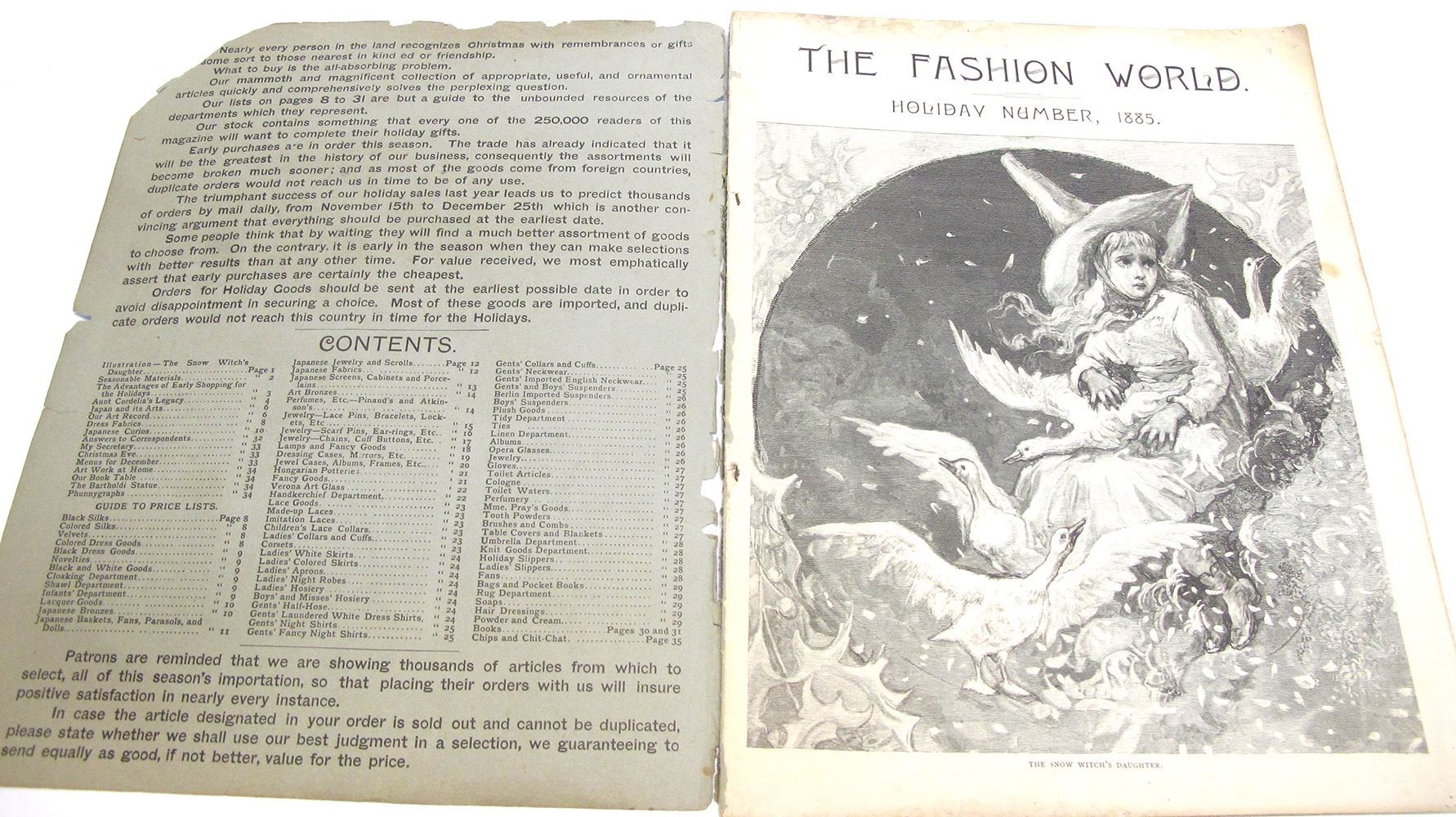 The Fashion World by Jordan, Marsh and Co, Boston, Mass. 1885. Catalog of fashion accessories pottery, Japanese curios, jewelry, books and more. Some illustrations.11.75" x 9". Front cover is missing right upper corner, cover is detached. Date: Location: Boston, Massachusetts HWAC # 54175