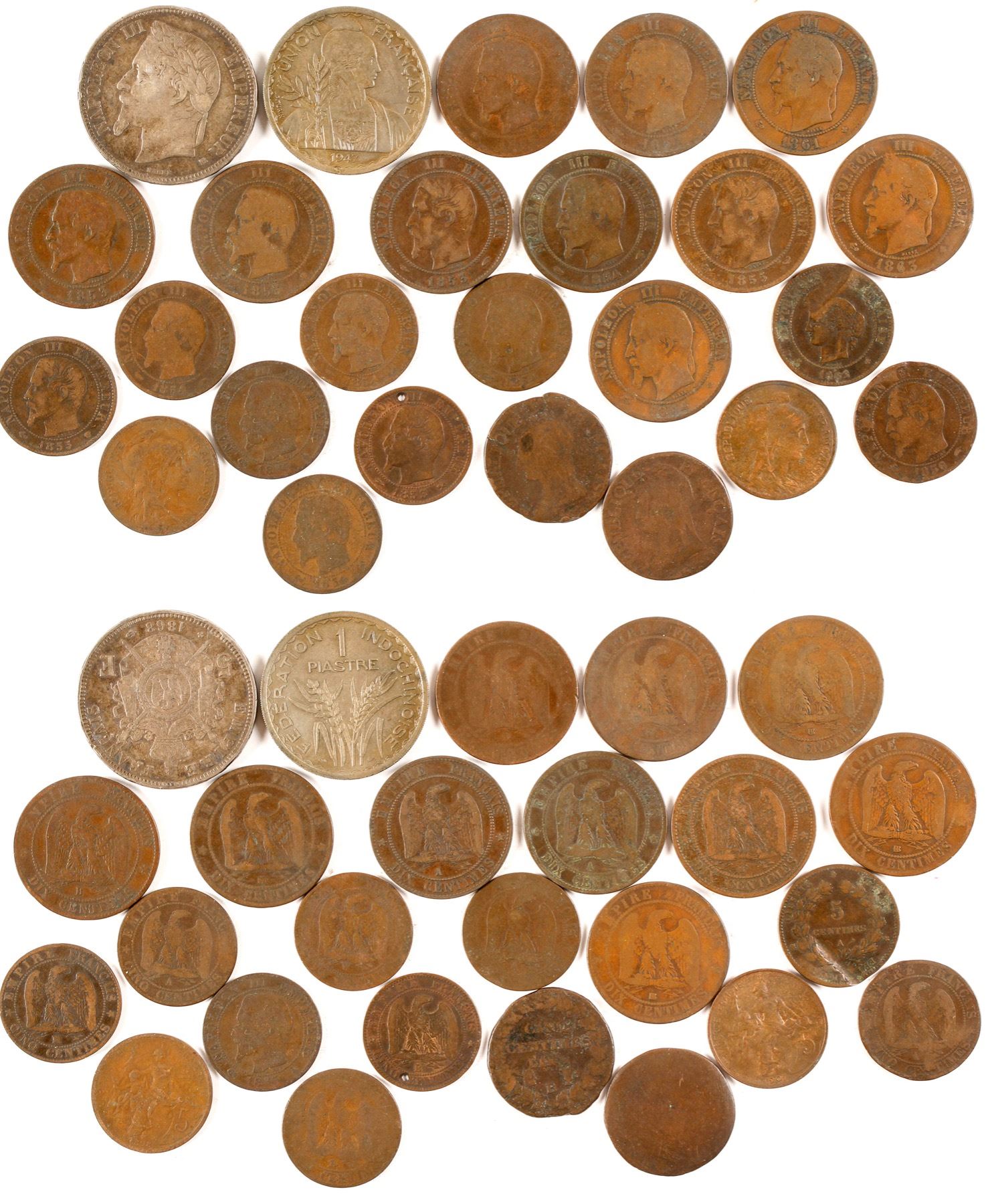 Twenty five coins from the 1800s. One 5 franc (1868),ten Dix Centimes; 13 cinq centimes; and one 1 piastre from French Indochina, 1947. State: France City: Date: HWAC# 85571