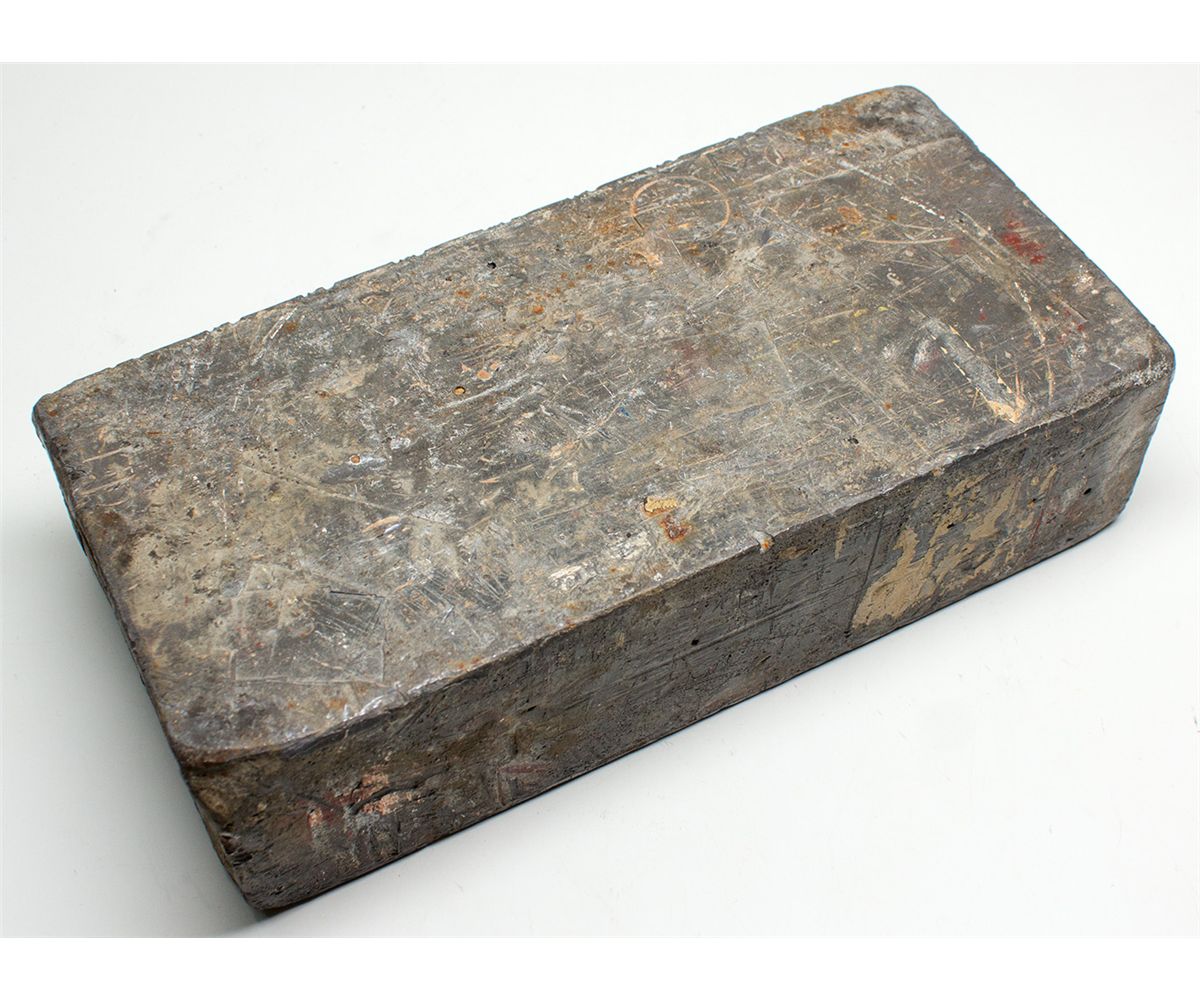19th Century Lead-silver ingot, from "Central Nevada." This unique and special ingot is 4" x 8" x 2", the exact size of a brick. There are no punch marks of any kind, other than two small imprints from square nails. While the surface is lead gray, the ingot must have a very interesting history. We have not yet had it assayed. Here are the interesting attributes: 1. There are classic 19th century assay chips taken from opposing corners. 2. There are two places on the ingot where there are apparent gold "fragments". These are not separated gold, as occurs from high concentrations of gold in a dore bar, where the gold starts to part from the mix. My conclusion from this is that the ingot may be made of floor scrapings, dust and debris from an assay office or large scale mine operation 3. The long sides of the "brick" show paint residue, leading to the conclusion that this ingot was used, or placed in a wall as "brick". 4. The "brick" was found in Fallon, Nevada. The obvious near-source locale for lead is Eureka, where the Richmond and Eureka Consolidated mines operated. Both were major silver-lead producers in Nevada's history. Other mines nearby carried significant amounts of gold (viz: the Windfall mine). Austin is another possible source. 5. The "brick" shape is non-standard for a lead-silver mine, and is thus potentially home made by the melter or assayer, specifically to hide in a wall. Whatever the real story is behind this fascinating ingot, it is sure to be a story-teller today.City: County: State: NVDate: