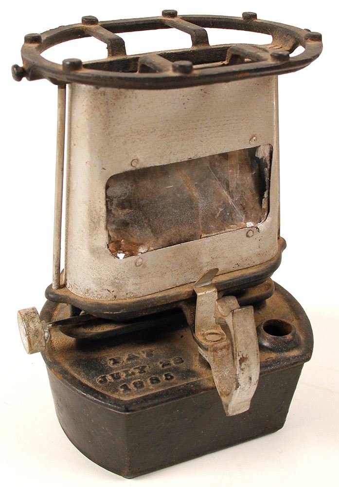 9.25" tall IRON CLAD WICK STOCK. Hinged top, patented 1855. Fuel cap missing, front lens? damaged. (Al Adams Gold Rush Memorabilia Collection) Date: Location: HWAC# 58705